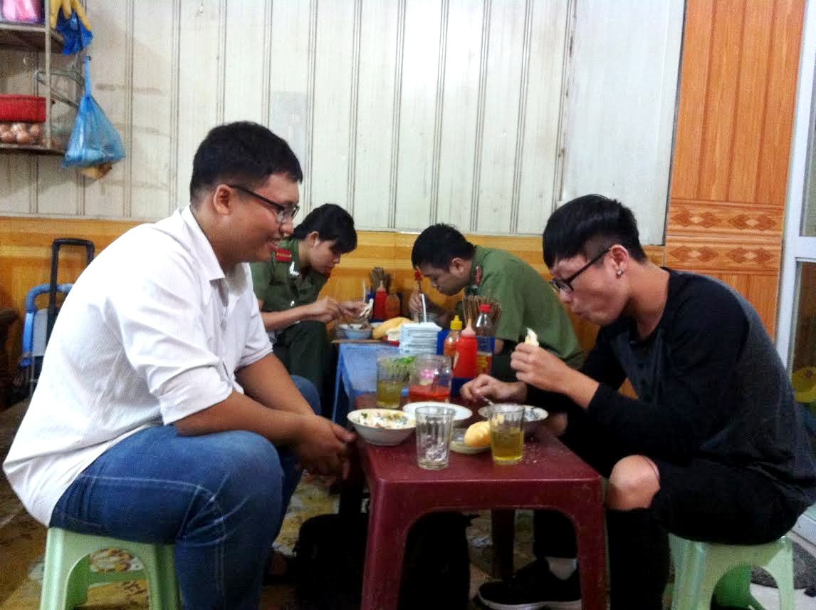 | Đồ ăn ngon, nhiều, rẻ, quán bánh mì bò xào trở thành địa chỉ quen thuộc của Kiều Lê Kiên (trái), SV Học viện Bưu chính Viễn thông. Ảnh: Diệp Sa. |