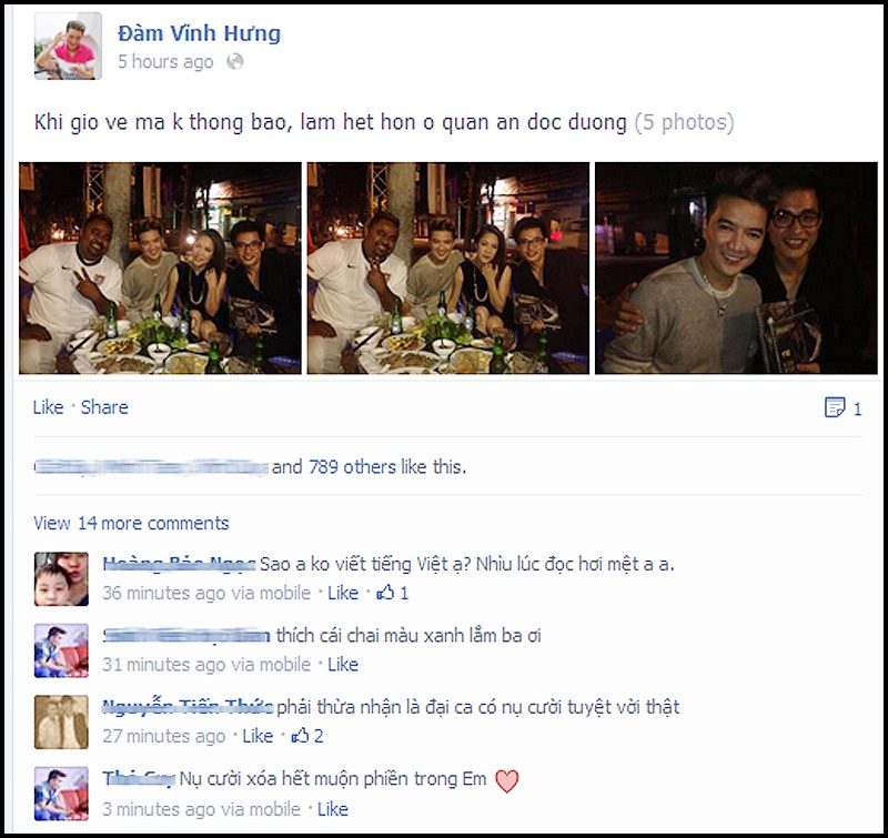 Tối 26/8, Đàm Vĩnh Hưng bất ngờ chia sẻ hình ảnh của vợ chồng ca sĩ Thu Phương và Dũng Taylor trên trang cá nhân. Anh viết một cách hài hước: "Khỉ gió về mà không thông báo, làm hết hồn ở quán ăn dọc đường".