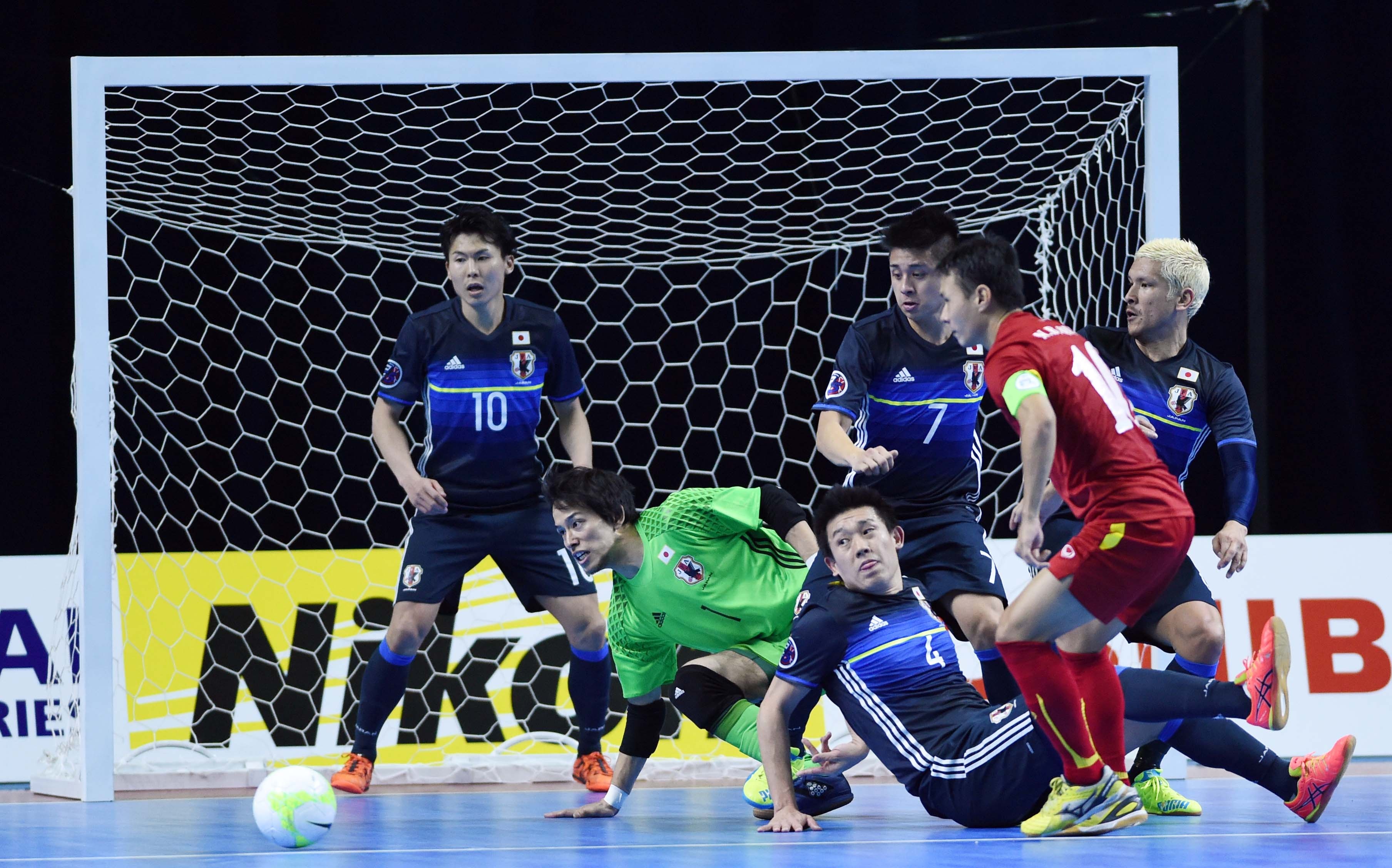| Bảo Quân bình tĩnh, tự tin thi đấu trước 4-5 cầu thủ futsal Nhật Bản. |