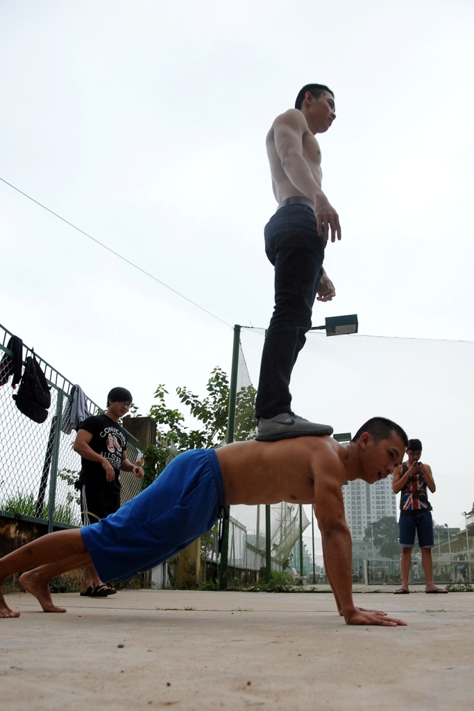 | Xuất hiện ở Sài Gòn khoảng một năm, môn thể thao Calisthenics thu hút nhiều nam sinh tập luyện. Các thành viên nhóm Sài Gòn Calisthenics khởi động bằng cách tay người này đặt lên vai người kia và cùng hít đất. |