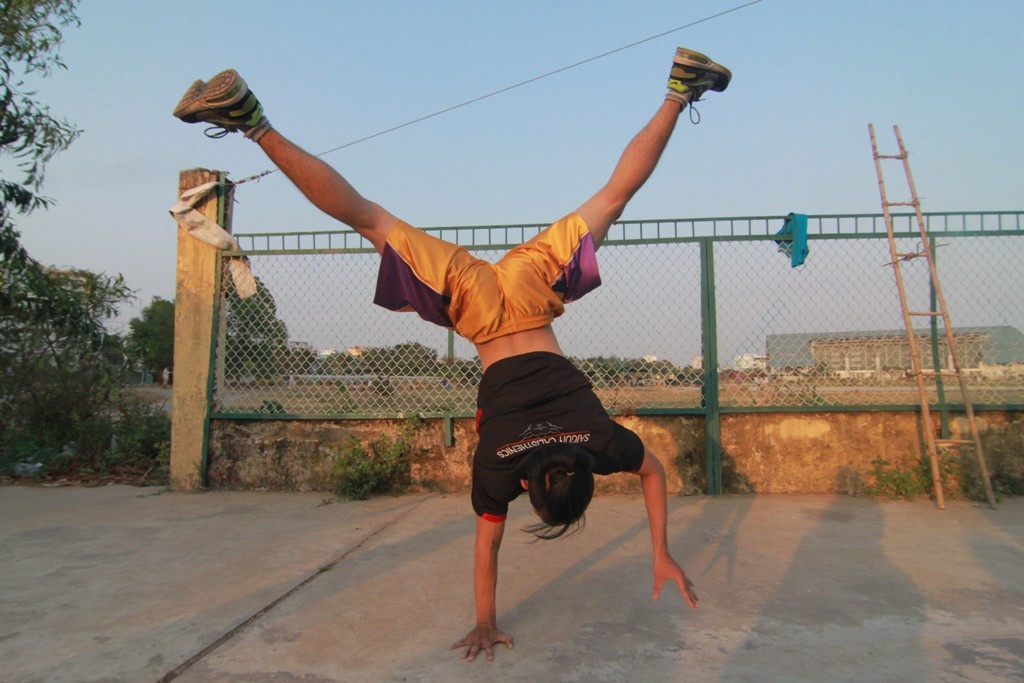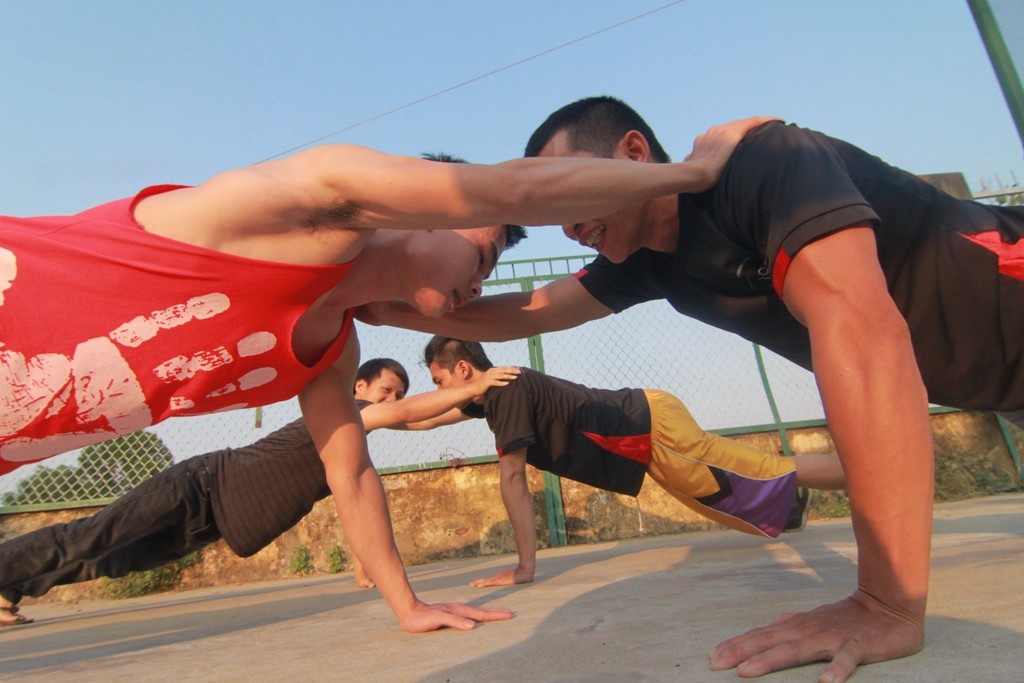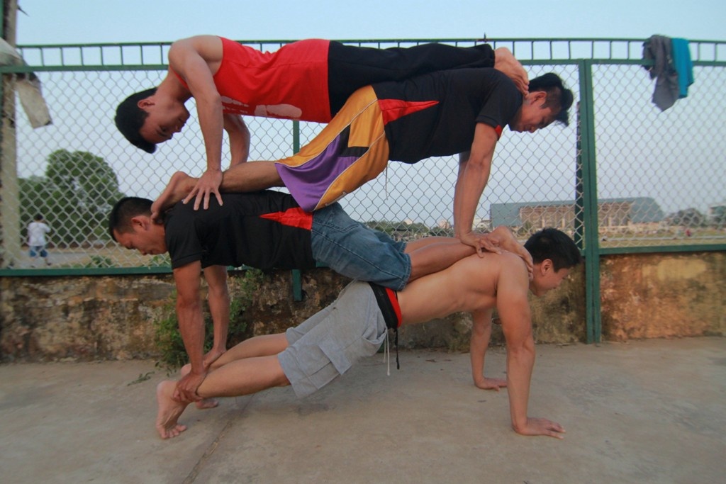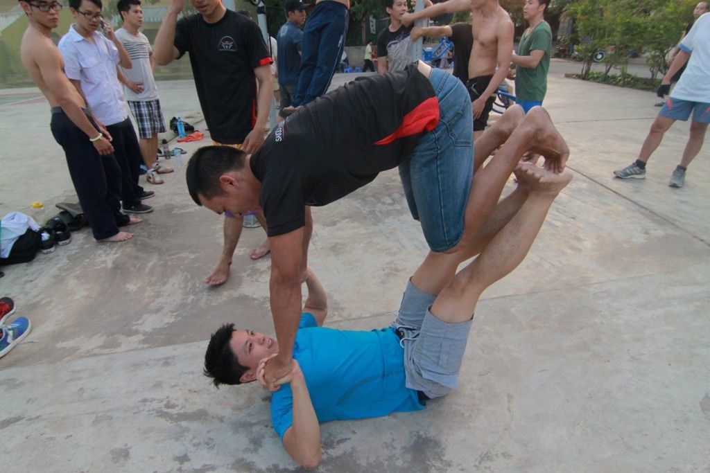 | Đỗ Việt Cường (29 tuổi) thực hiện động tác chống đẩy với người. Theo Cường, môn này hấp dẫn vì có thể tự nghĩ ra nhiều kỹ thuật mới và thách đấu với người khác qua độ khó của các chiêu thức. |