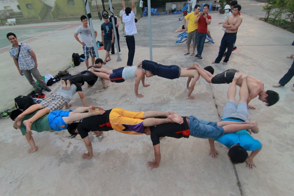 Cách chồng người hít đất. Calisthenics là một bộ môn tương đối mới mẻ có nhằm phát triển sức mạnh của cơ thể dựa trên trọng lượng của chính bản thân. Nhóm Sài Gòn Calisthenis là nhóm đầu tiên và duy nhất ở TP.HCM tập luyện môn này.