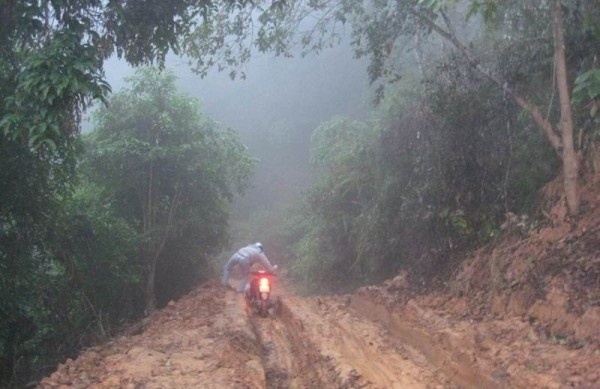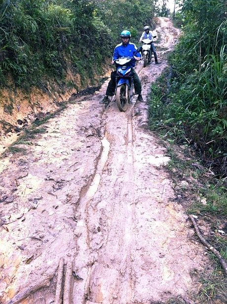 Đoạn offroad dài khoảng 20 km, bắt đầu từ ngay con đường hẹp rẽ vào bản. Con đường đất này rất trơn, khi xuống dốc, xe của Đức bị rê bánh, trượt dài 1 m và cứ thế lao xuống cho đến khi mắc vào một ổ đất thì xe đổ. Rất may là cả Đức lẫn bạn nữ ngồi sau đều không sao.