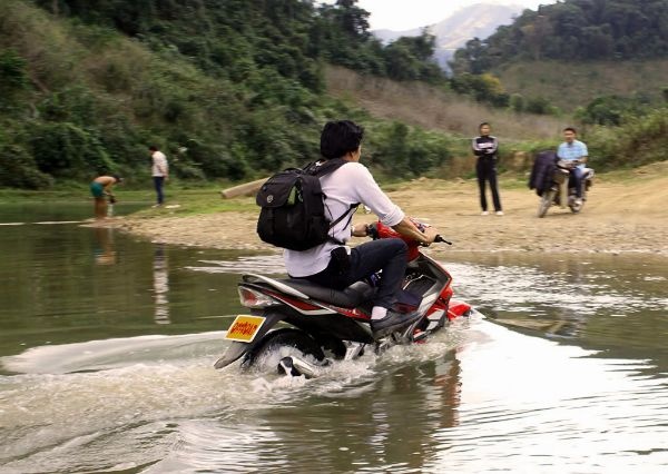“Cách đây 3 năm, đường xá khó đi hơn bây giờ rất nhiều. Chúng mình offroad 60 km, tính từ đoạn rẽ từ Mai Châu tới Pù Luông. Khó đi nhất là con dốc ở Kho Mường vì đường trơn như mỡ, không có chỗ bám, xuống cũng khó, lên cũng khó. Mỗi lần lên dốc, một xe phải có 3 người: “Xế” thì ngồi trên xe nhấn ga, 2 người phía sau đẩy xe. Lần ấy, đoàn mình ai cũng ngã ở đoạn này nhưng may chỉ xây xát nhẹ”.