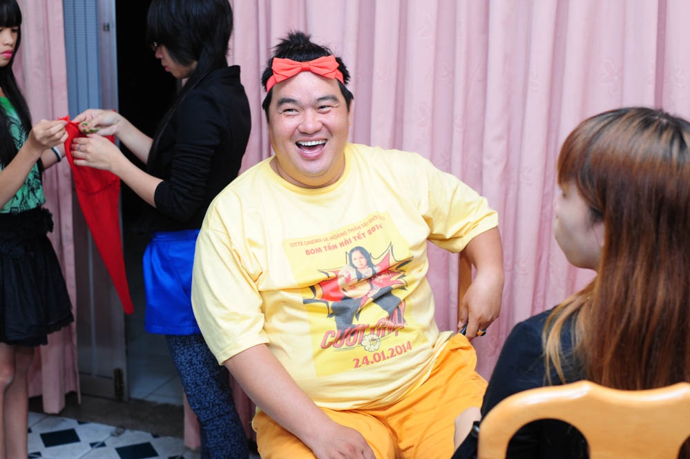| Diễn viên hài Hoàng Mập luôn cười tươi ở phía hậu trường. Anh cũng tranh thủ PR cho bộ phim mới của mình khi mặc chiếc áo có in poster và ngày khởi chiếu Cưới chạy. |