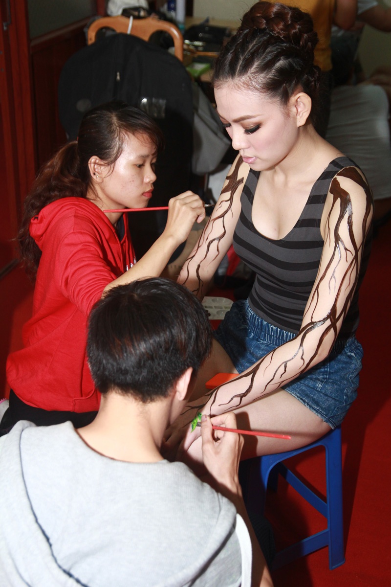 | Thu Thủy đã phải có mặt từ rất sớm tại nhà thi đấu Quân khu 7 và phải ngồi yên hơn 2 tiếng đồng hồ để nhà thiết kế Tuấn Trần (cũng là người thiết kế trang phục cho cô trong đêm thi thứ 4 này) hoàn thành tác phẩm trên cơ thể của mình. |