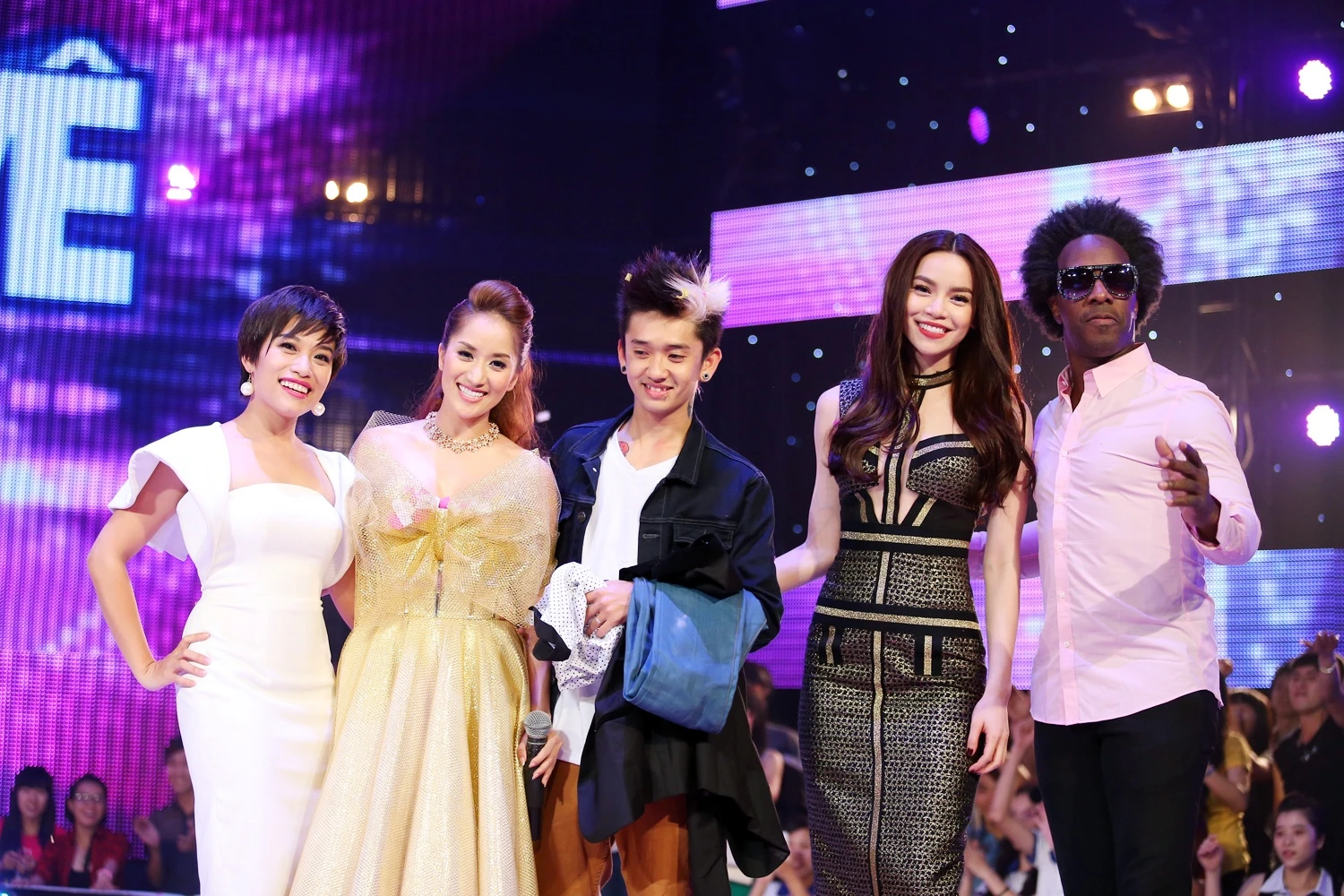 MC Khánh Thi và bộ tứ giám khảo Trần Ly Ly, Hồ Ngọc Hà, Dumbo, Alfredo Torres chụp ảnh lưu niệm cùng nhau. |