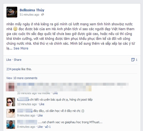 Đồng quan điểm với Hà Anh, Hoa hậu Việt Nam 1994 Thu Thủy khá tâm đắc và cho rằng đây là những thông tin rất chính xác, thú vị. Ngoài ra, cô cũng bổ sung và chỉ rõ thêm những lý do Hoa hậu Việt chưa đạt được với chuẩn chung của quốc tế.