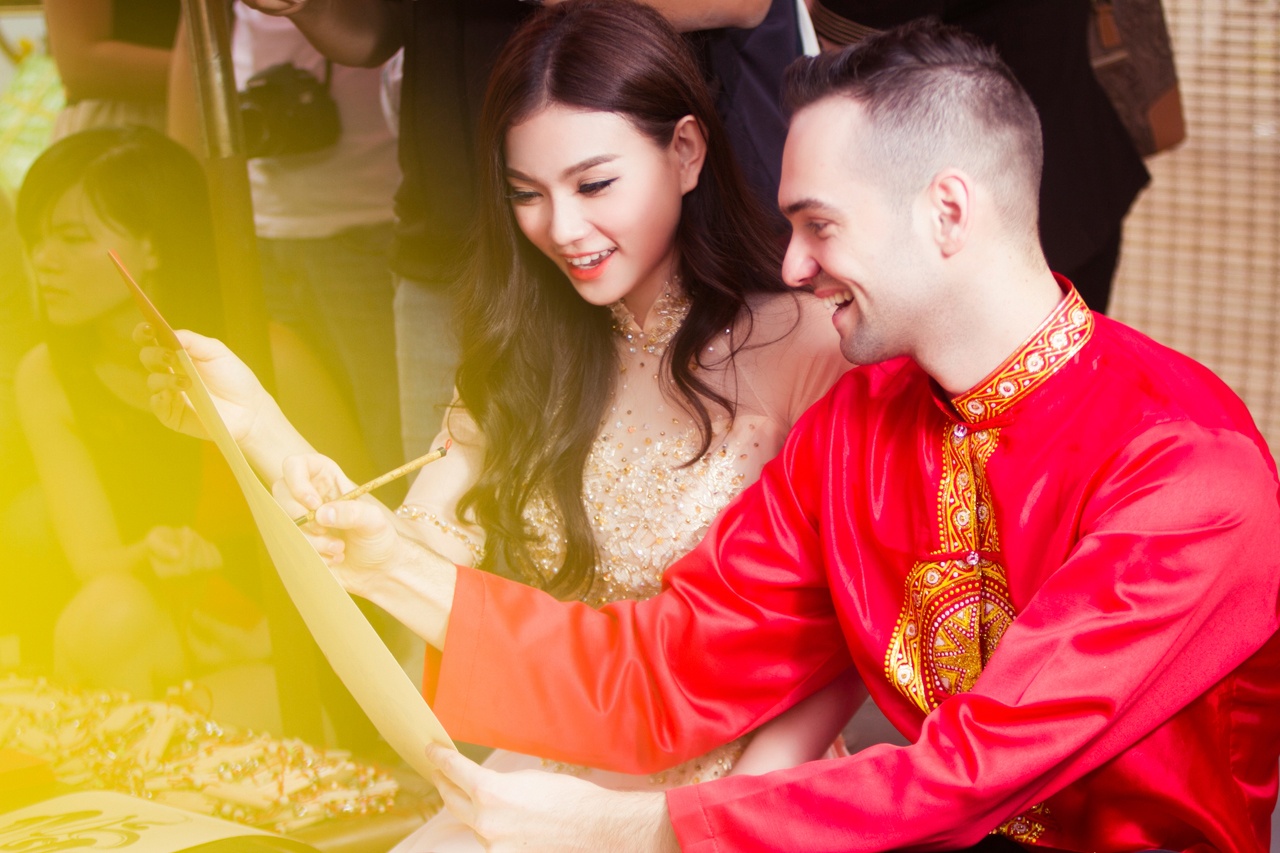 Anh chàng đặc biệt hào hứng cùng Thu Thủy đi xin chữ cầu may đầu năm.