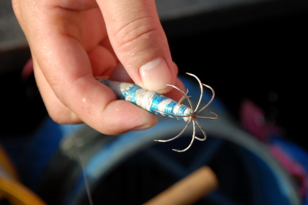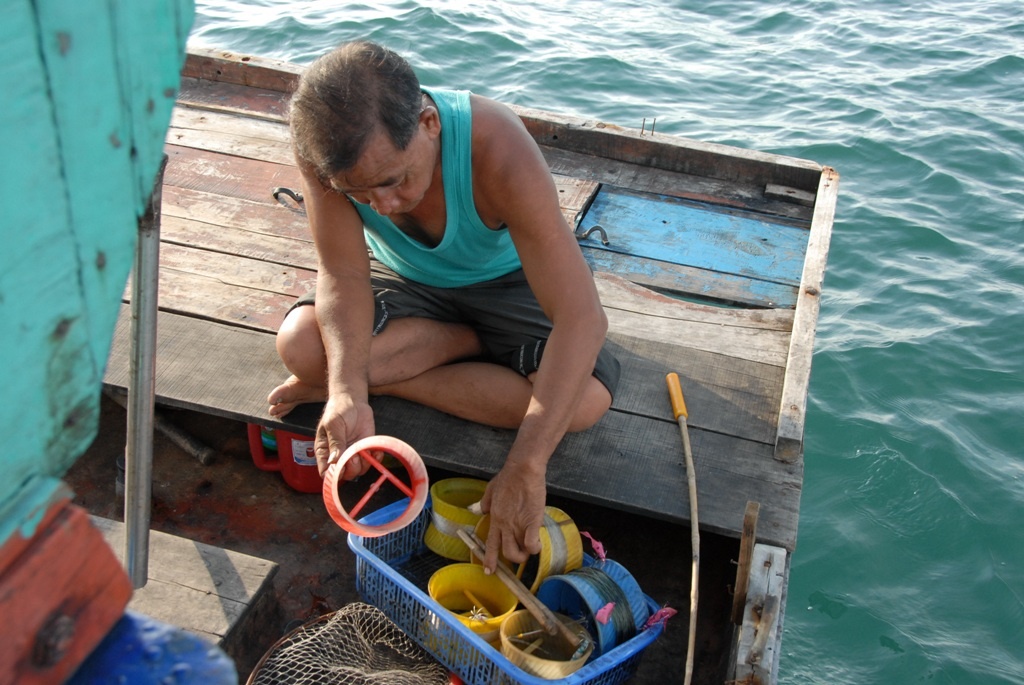 Đồ nghề câu mực của người dân ở đây khá đơn giản, chỉ gồm cần câu bằng tre, bộ lưỡi chùm, dây gân và miếng mồi làm bằng cao su sơn màu sặc sỡ để dụ mực cắn câu.