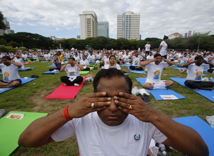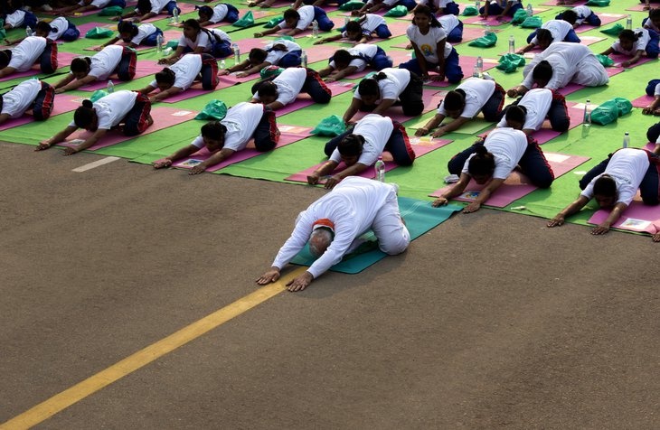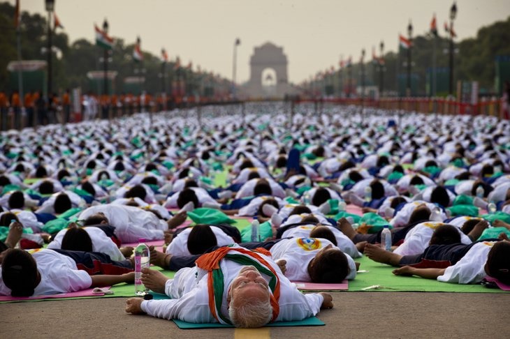 | Thủ tướng Ấn Độ Narendra Modi cùng hàng vạn người, bao gồm thành viên nội các và các nhà ngoại giao nước ngoài, tập trung tại đại lộ lớn ở trung tâm thủ đô New Delhi hôm 21/6 để thực hiện những động tác yoga. Tại bang Gujarat, quê hương của thủ tướng, giới chức cho biết, hoạt động chào mừng Ngày Quốc tế Yoga diễn ra tại gần 30.000 địa điểm. |