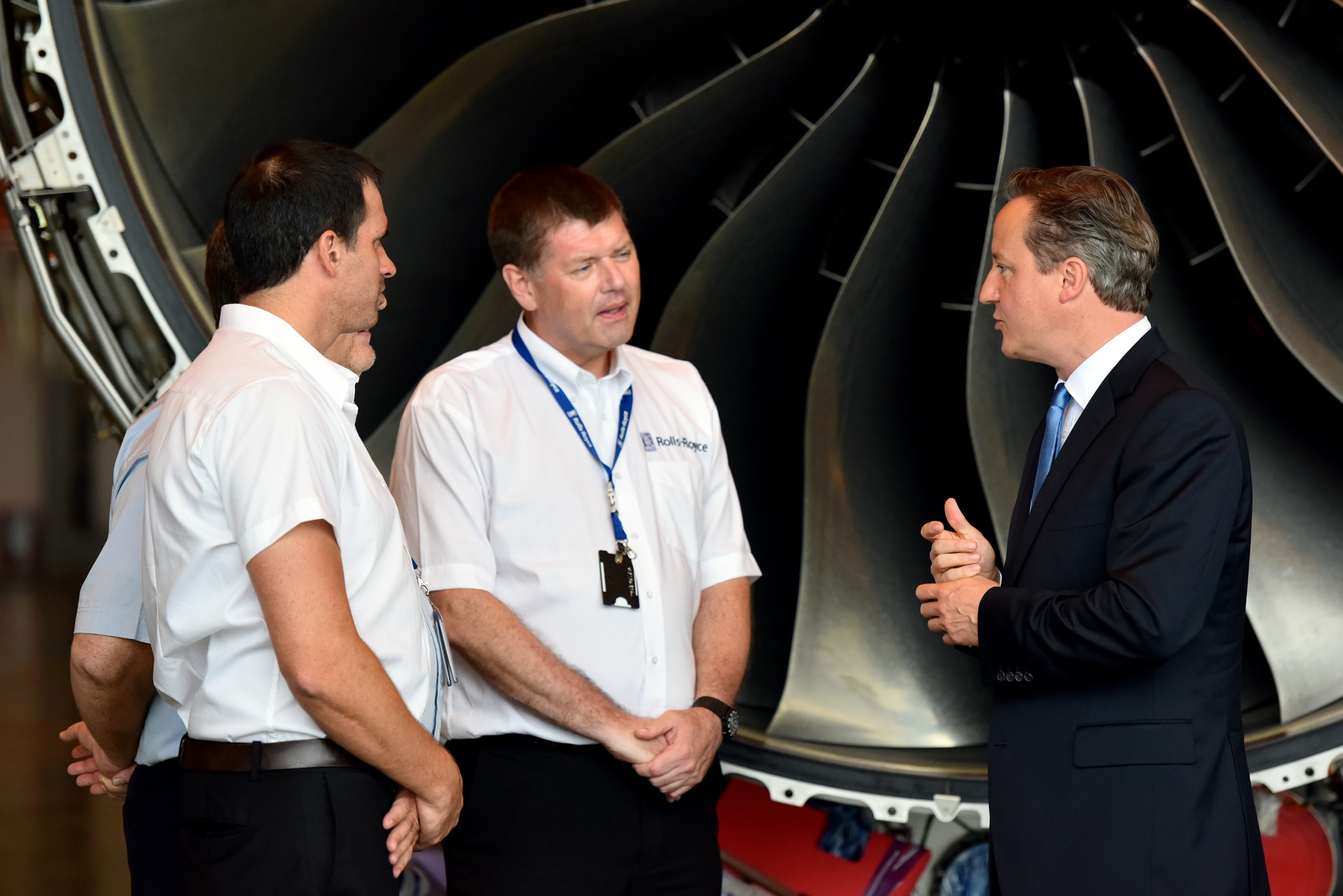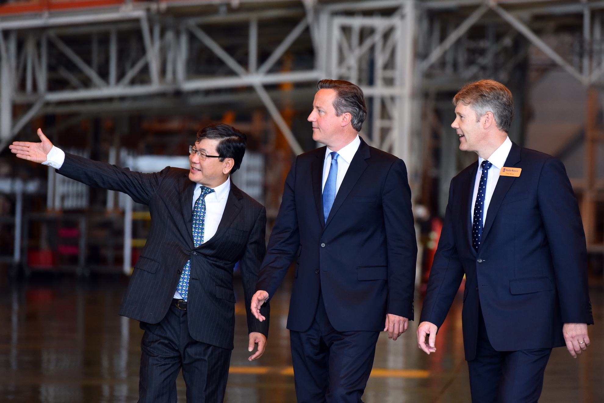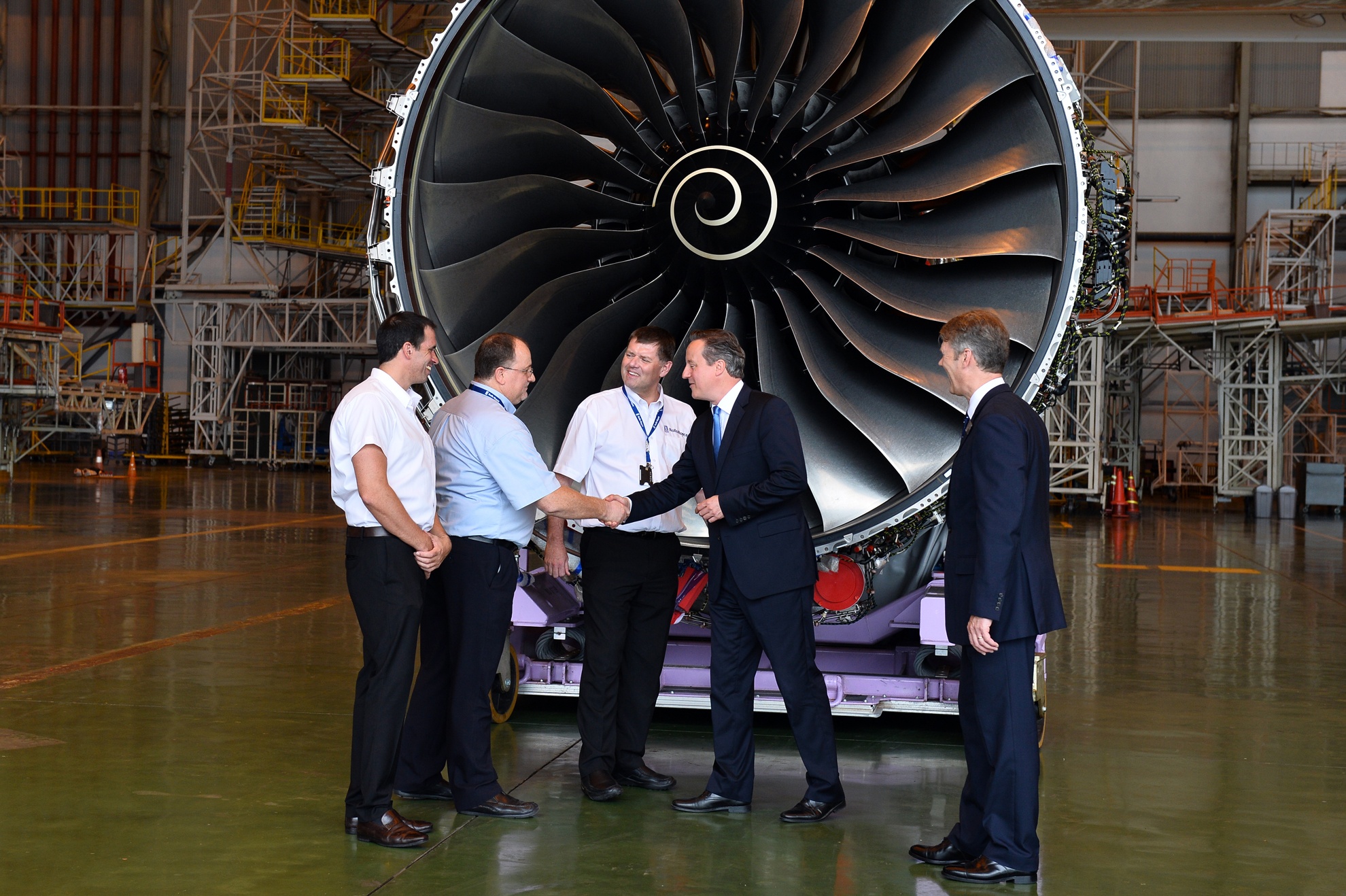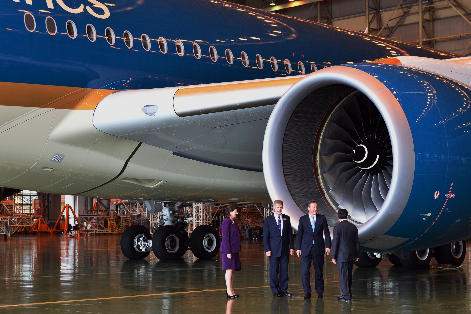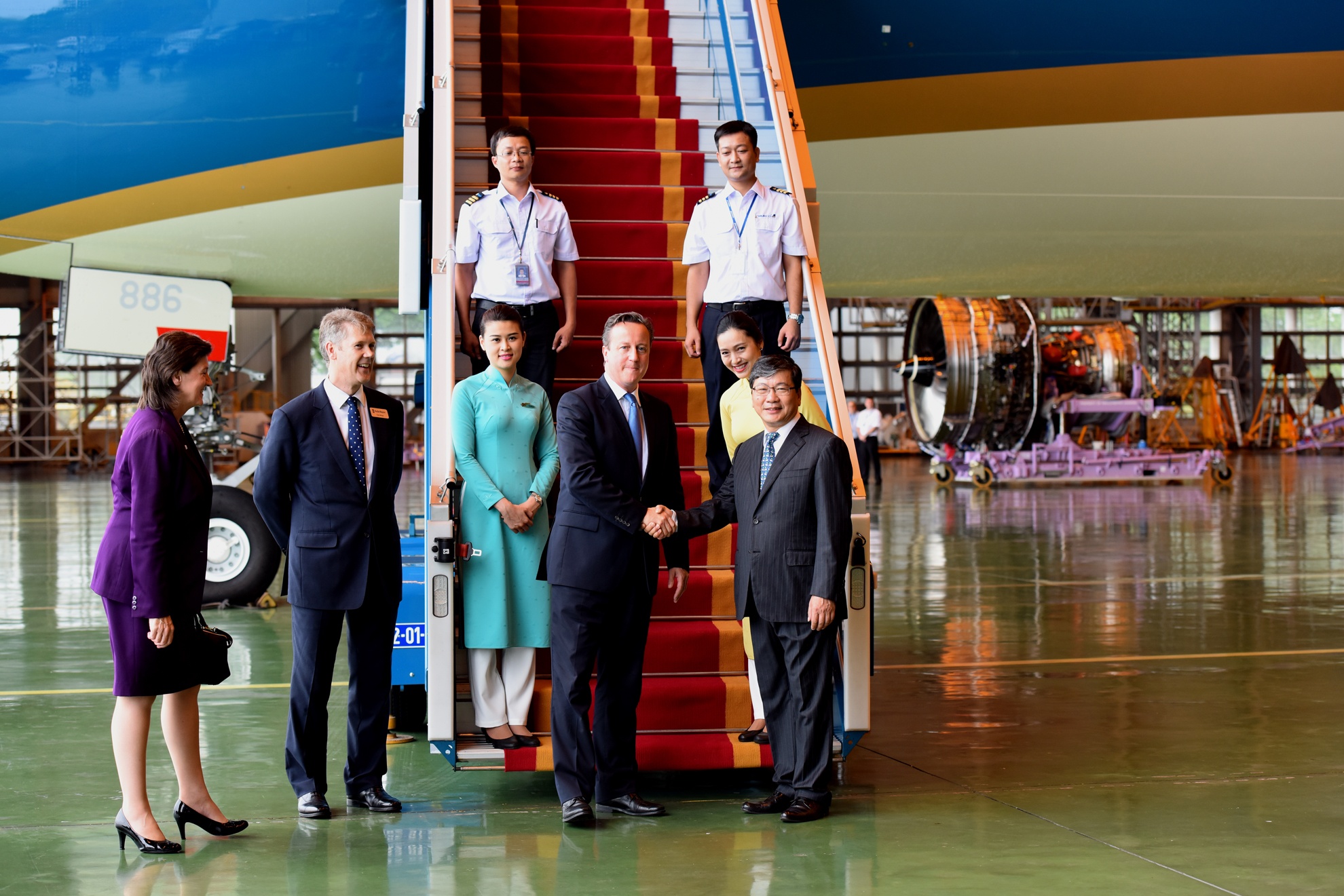 | Thủ tướng Anh trò chuyện thân mật với đội ngũ kỹ sư của Rolls-Royce. Trong năm 2015, Vietnam Airlines là hãng hàng không thứ hai trên thế giới khai thác dòng máy bay A350-900 XWB. Hãng sẽ thay toàn bộ đội bay thân rộng gồm 33 chiếc, trong đó 19 Boeing 787 và 14 chiếc Airbus A350. |