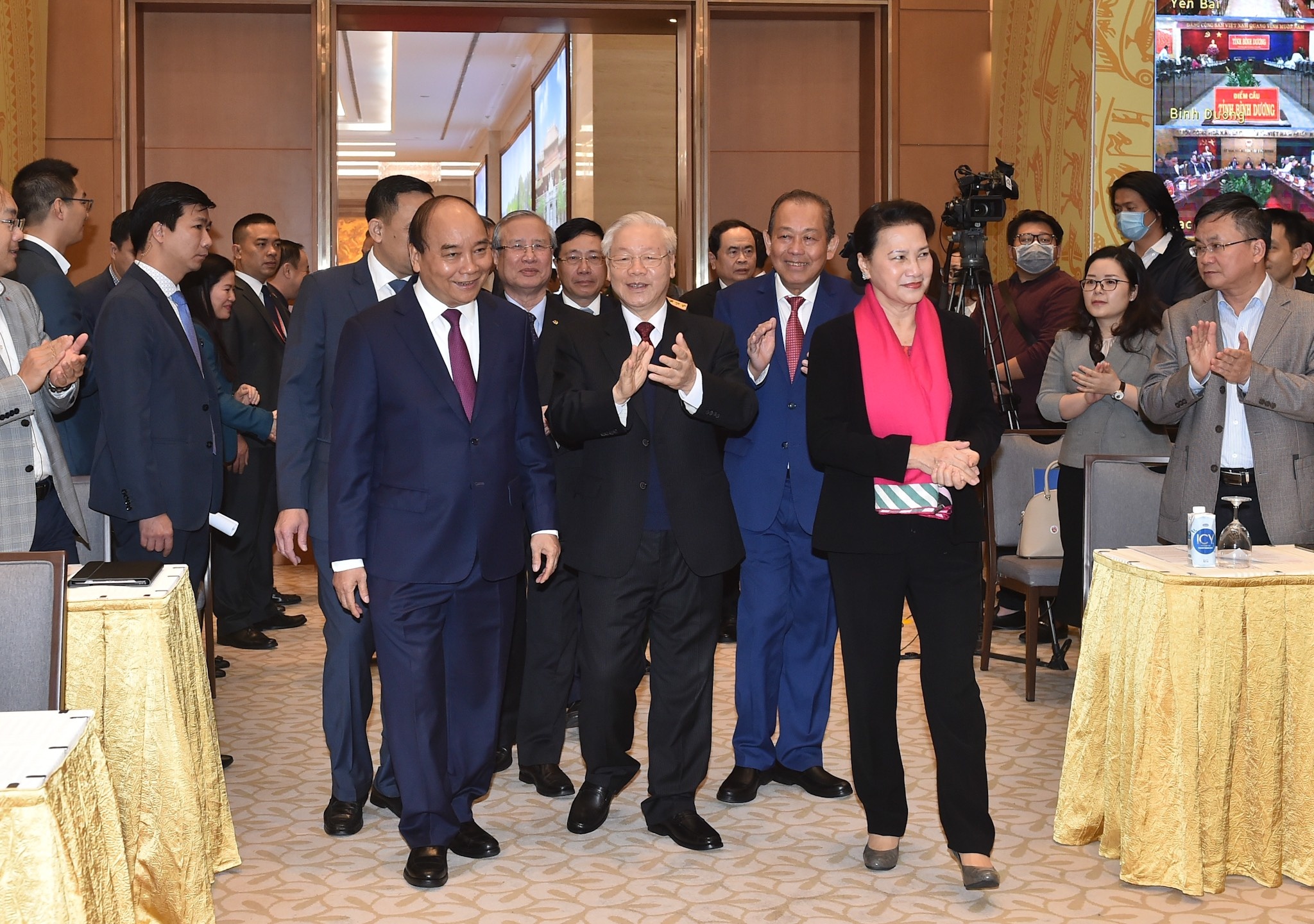| Tổng bí thư, Chủ tịch nước Nguyễn Phú Trọng, Thủ tướng Nguyễn Xuân Phúc và Chủ tịch Quốc hội Nguyễn Thị Kim Ngân cùng nhiều lãnh đạo cấp cao dự Hội nghị trực tuyến Chính phủ với các địa phương. Ảnh: VGP. |