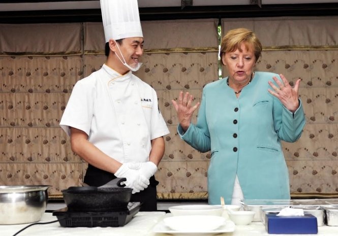 | Bà Merkel được một đầu bếp Trung Quốc hướng dẫn nấu món gà sốt chua ngọt nhân một chuyến thăm Trung Quốc. Ảnh: zenfs.com |