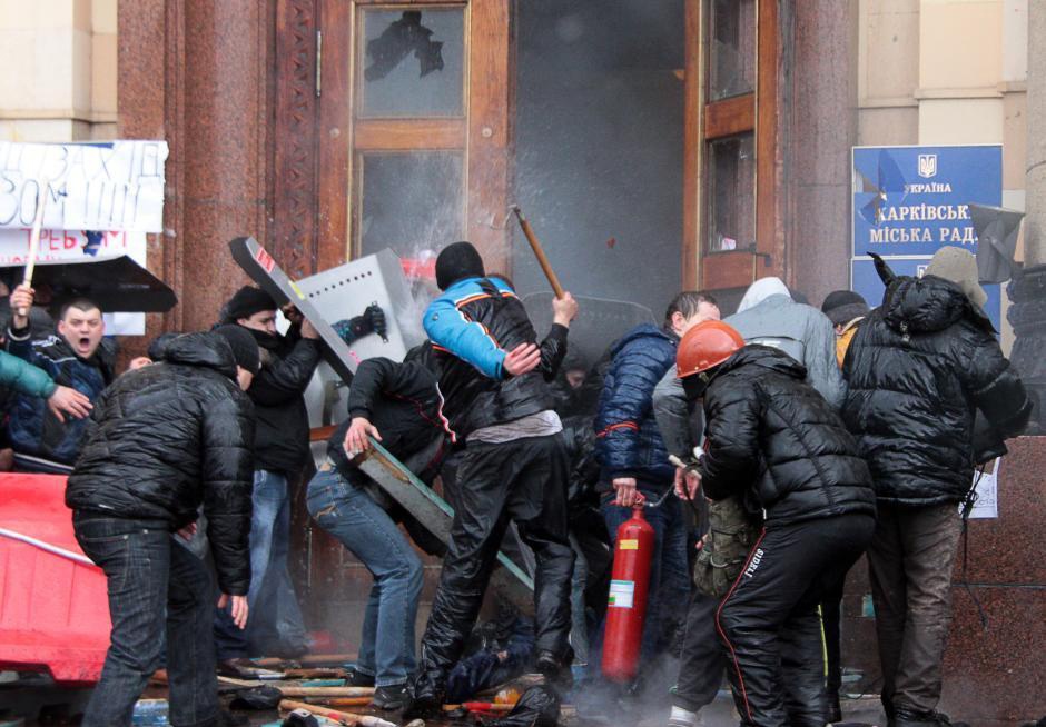 | Tại Kharkov, miền đông Ukraina, khoảng 20.000 người ủng hộ Nga gây ra cảnh hỗn loạn khi cố gắng xông vào các tòa nhà chính quyền địa phương. Ảnh: Chinanews |