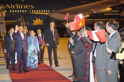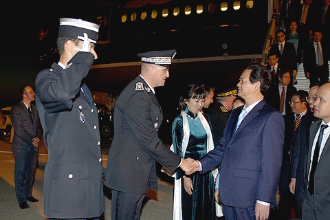 | Thủ tướng Nguyễn Tấn Dũng và phu nhân, cùng Đoàn cấp cao Việt Nam đến sân bay quốc tế Orly Paris, tối 23/9 (giờ địa phương), bắt đầu chuyến thăm chính thức Cộng hoà Pháp. Ảnh: VGP/Nhật Bắc. |