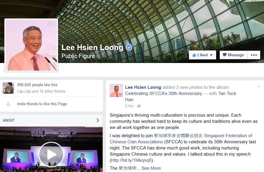 Sự lớn mạnh không ngừng của các mạng xã hội kéo theo những cách quản lý mới của các nhà lãnh đạo "thời @". Với tài khoản Facebook được 890.649 lượt thích (tính tới ngày 10/11/2015), Thủ tướng Singapore Lý Hiển Long là một trong những nhà lãnh đạo khá thành công với mạng xã hội. |