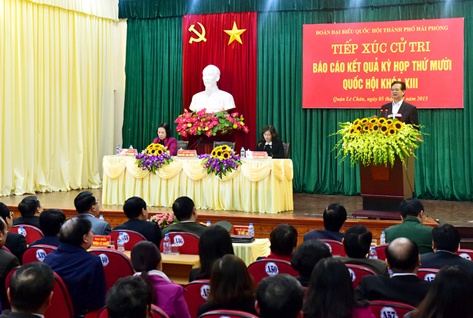 Tại buổi tiếp xúc, các cử tri cũng nêu một số đề xuất, kiến nghị đối với Đảng, Nhà nước và TP Hải Phòng liên quan đến việc xây dựng cơ chế, chính sách nhằm thu hút các nguồn lực cho đầu tư phát triển; việc giảm thiểu tình trạng quá tải bệnh viện; hỗ trợ ngư dân phát triển nuôi trồng thủy sản, thúc đẩy phát triển kinh tế biển đi đôi bảo vệ độc lập, chủ quyền, lãnh thổ, biển đảo thiêng liêng của Tổ quốc; các giải pháp nâng cao chất lượng nguồn nhân lực, tạo việc làm, tăng thu nhập cho người lao động.