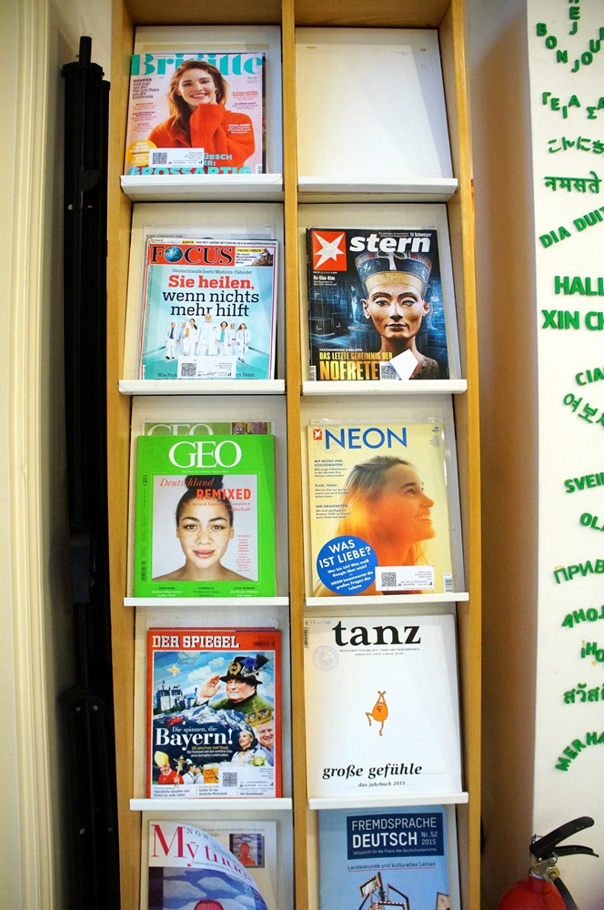 | Các tạp chí như: Fokus, Stern và Der Spiegel luôn sẵn trên giá để mọi người tìm hiểu về những đề tài chính trị, xã hội thời sự nước Đức. |