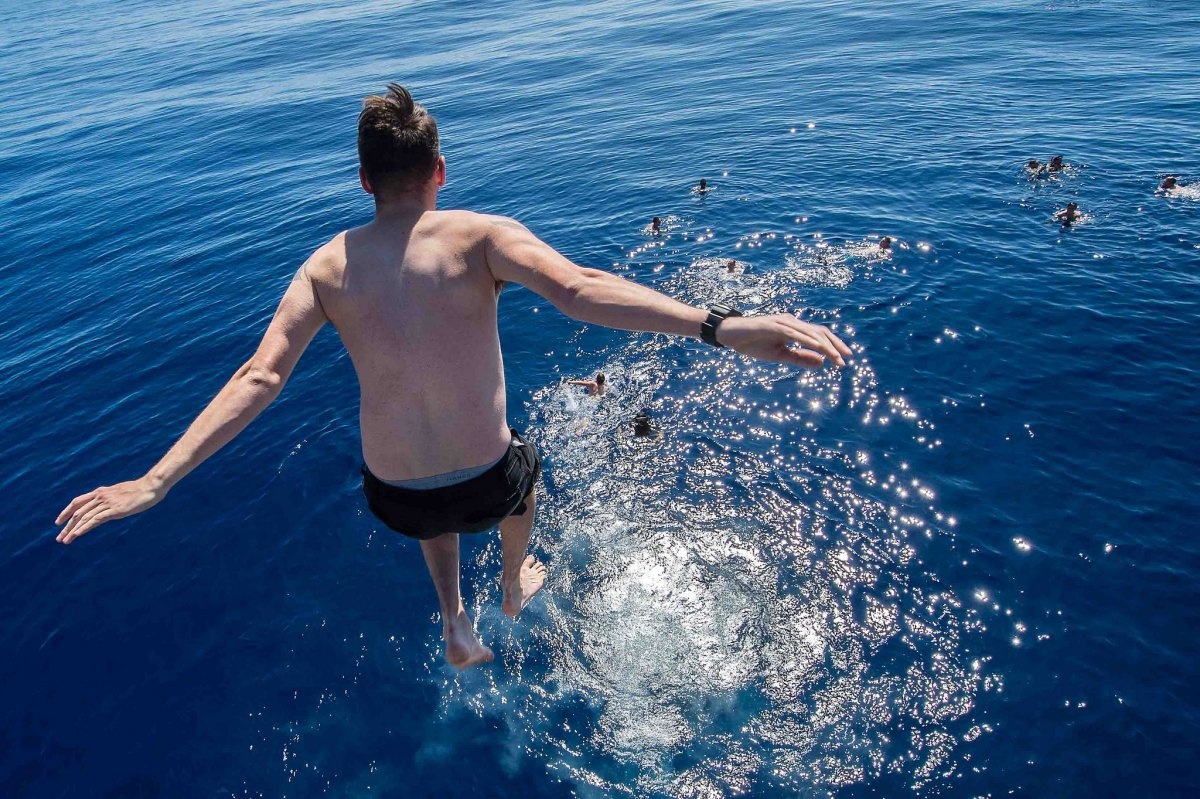 Thú vui của thủy thủ Mỹ trên tàu đổ bộ tấn công USS Iwo Jima, lớp Wasp khi nó thả neo trên vịnh Aden. Việc bơi lội cần được sự cho phép đặc biệt từ các chỉ huy của tàu. |