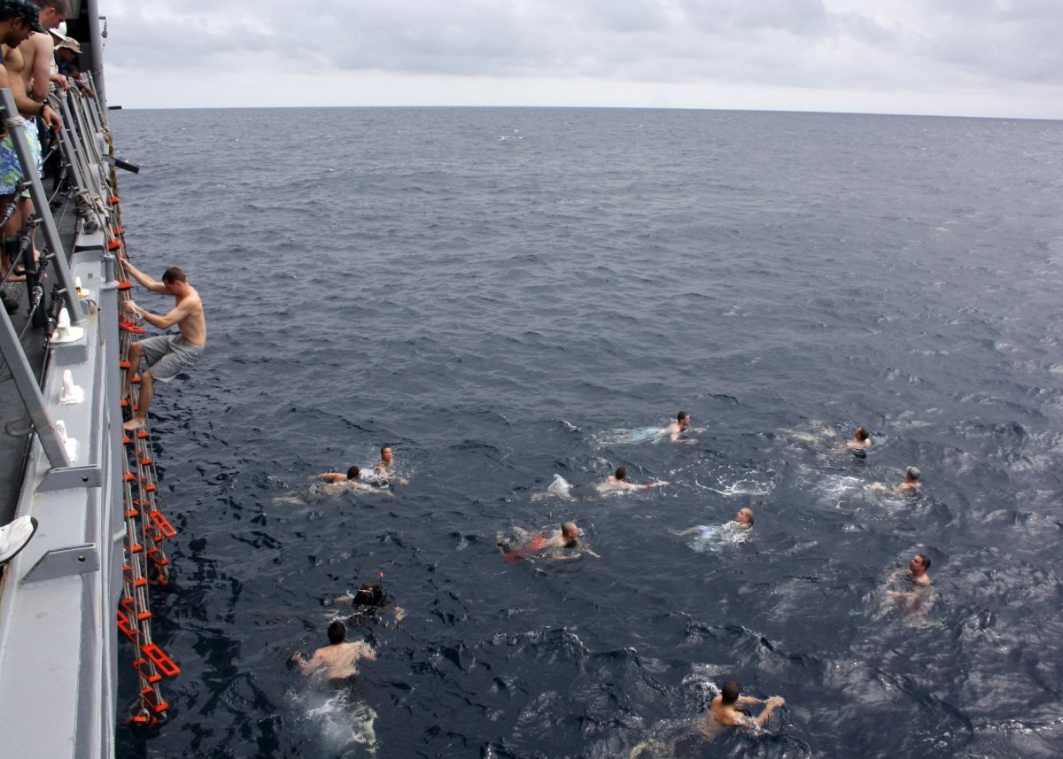 Thủy thủ Mỹ nhảy xuống biển Thái Bình Dương từ chiến hạm USS Mobile Bay, tàu khu trục trang bị tên lửa dẫn đường lớp Ticonderoga. Nó chính thức góp mặt trong biên chế Hải quân Mỹ năm 1987 và dự kiến bị loại biên trong năm nay. |