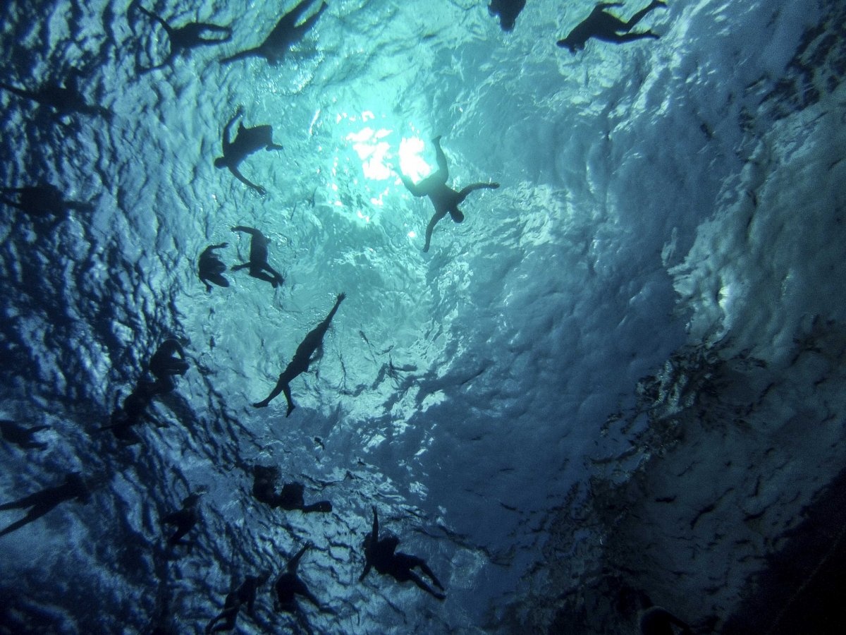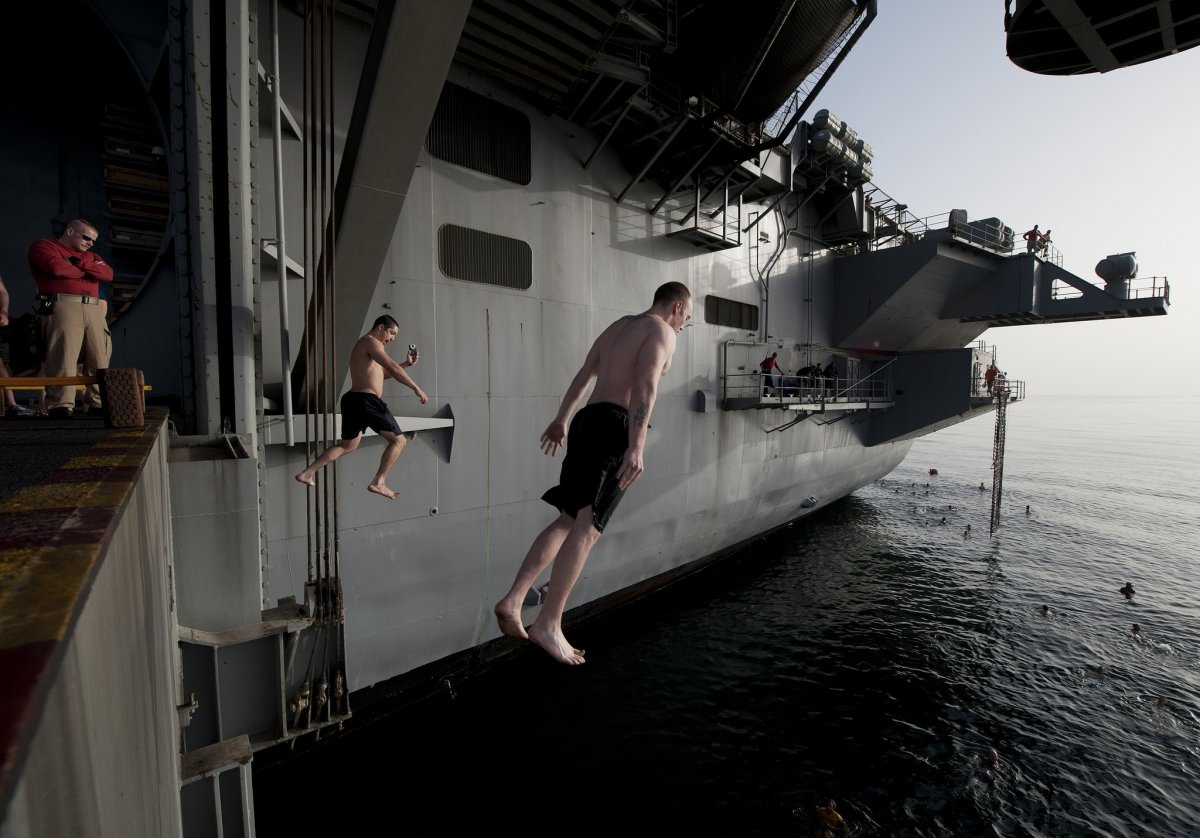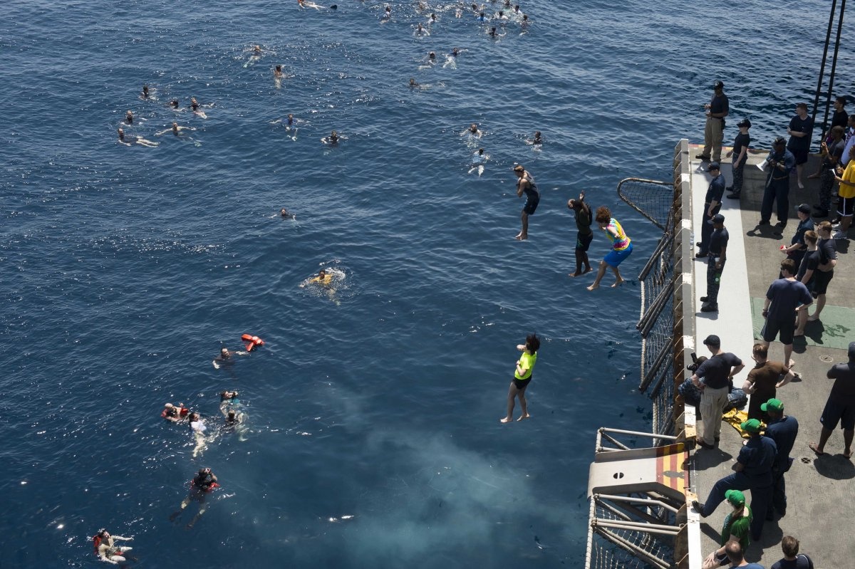 Thủy thủ nhảy từ tàu USS Antietam xuống Ấn Độ Dương. Giống với tàu USS Mobile Bay, USS Antietam cũng là chiến hạm thuộc lớp lớp Ticonderoga. Để đảm bảo an toàn cho các thủy thủ đang bơi lội, một nhóm binh sĩ được giao nhiệm vụ trông chừng cá mập từ trên tàu lớn và xuồng cao tốc gần đó. |