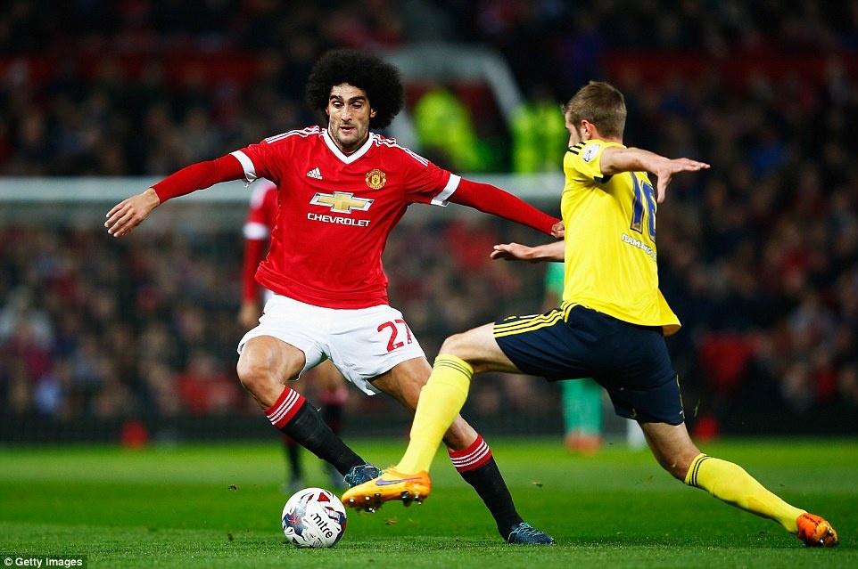 Tiền vệ Fellaini tung cú volley, nhưng không đủ hiểm hóc để đánh bại thủ môn Tomas Mejias.