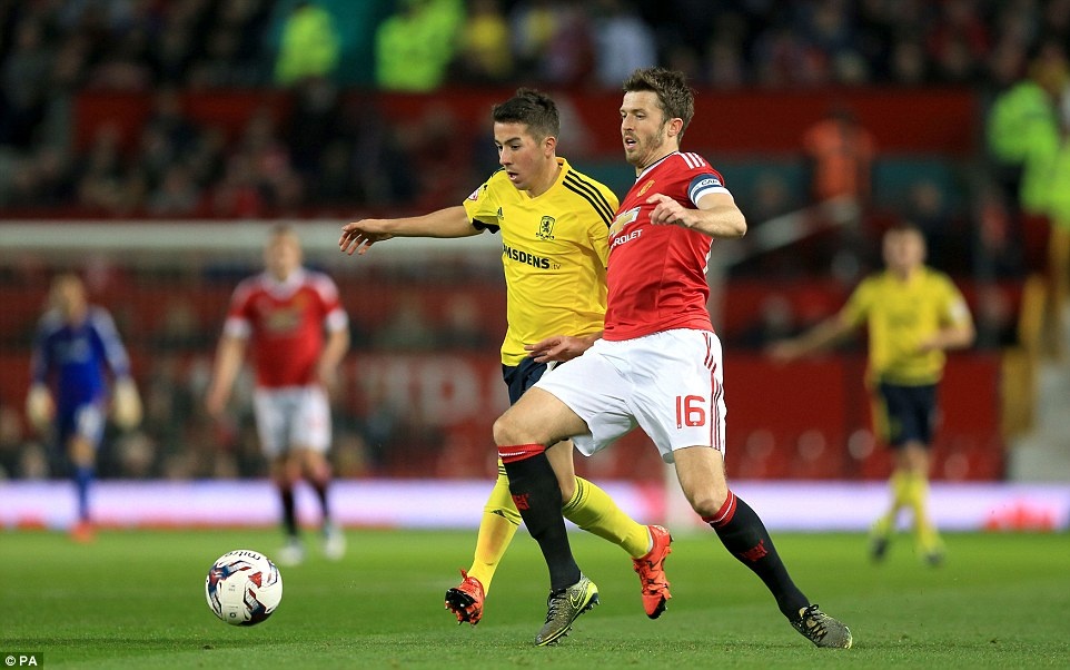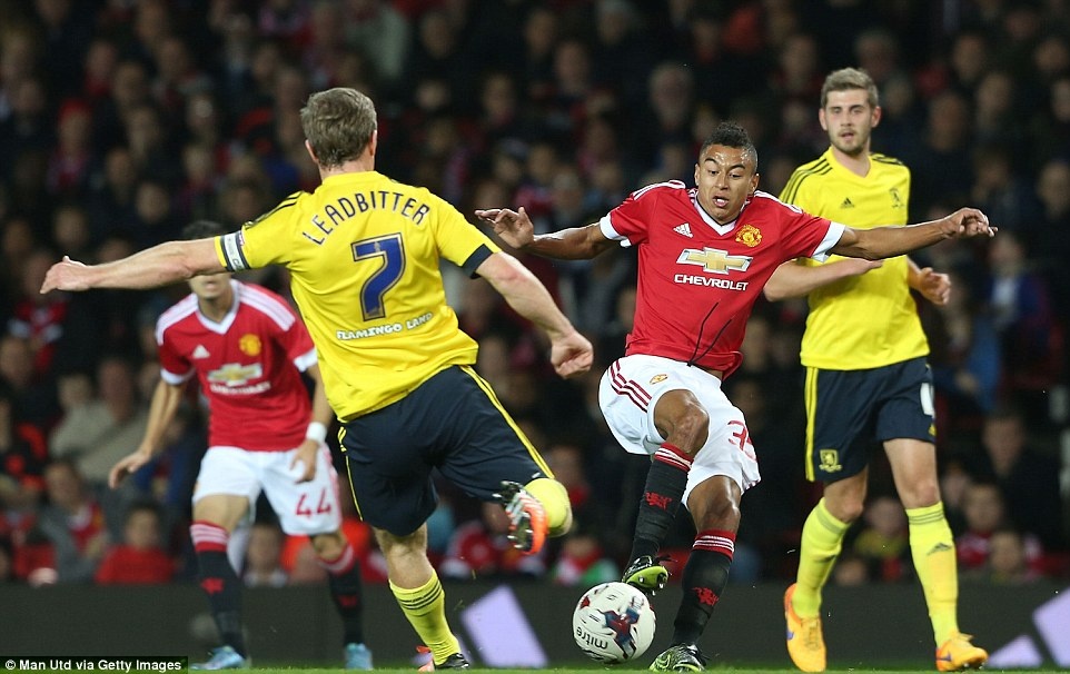 Tiền vệ trẻ Jesse Lingaard đá chính. Anh tranh bóng quyết liệt với thủ quân Grant Leadbitter bên phía Middlesbrough.