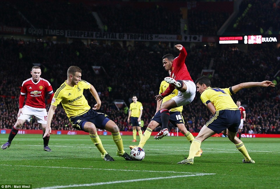 Chân sút Memphis Depay đá chính. Anh nỗ lực thi đấu nhằm ghi điểm với huấn luyện viên Van Gaal.