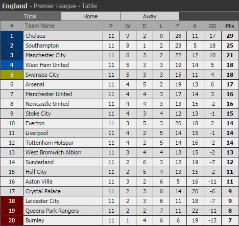 | Bảng xếp hạng Premier League sau vòng 11. |