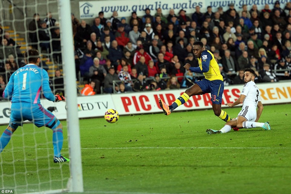 | Trong tư thế đối mặt nhưng Welbeck không thể thắng được người cũ của Arsenal, Fabianski. |