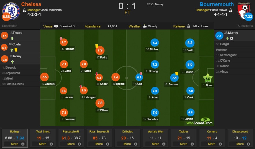Đội chủ sân Stamford Bridge nhập cuộc quyết tâm và tạo ra thế trận lấn lướt. Tuy nhiên, do không thể tung ra những “cú đấm” mang tính quyết định, The Blues phải trả giá đắt bằng bàn thua ở phút 82. Pha làm bàn của Glenn Murray có thể gây tranh cãi bởi cầu thủ này đã ở vào thế việt vị trước khi đánh đầu tung lưới Thibaut Courtois song Bournemouth cũng chẳng cần quá bận tâm.