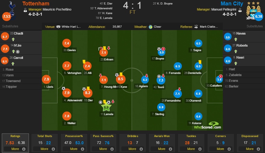 Trong khi hàng công bất lực trước lối chơi phòng ngự kín kẽ của đội chủ nhà, Man City tiếp tục nhận thêm 2 “vết đâm” chí mạng khác ở các phút 61 và 79. Harry Kane và Erik Lamela là những người lập công cho Spurs. Đáng chú ý, bàn thắng nâng tỷ số lên 3-1 của Kane vẫn tiếp tục là một phán đoán sai lầm của các trọng tài khi tiền đạo đội chủ nhà đã rơi vào thế việt vị trước khi sút tung lưới đối phương.