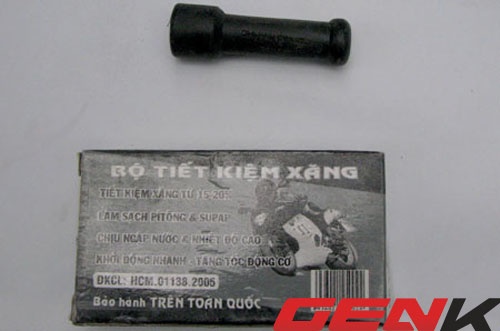 Theo lời chủ cửa hàng, có bán hai loại thiết bị tiết kiệm nhiên liệu. Một được giới thiệu là thiết bị tăng áp cho bugi, dùng để lắp vào giữa dây cao thế và phần đuôi nắp chụp bugi. Nó có tác dụng giúp bugi cháy tốt, làm hỗn hợp nhiên liệu cháy hiệu quả hơn, giảm lượng nhiên liệu bị tiêu hao. Theo lời quảng cáo thì thiết bị này có khả năng tiết kiệm nhiên liệu từ 15 đến 20%, không những thế còn giúp xe khởi động nhanh và tăng tốc động cơ. Thiết bị này không thấy ghi nguồn gốc xuất xứ và có giá bán 35 nghìn đồng.