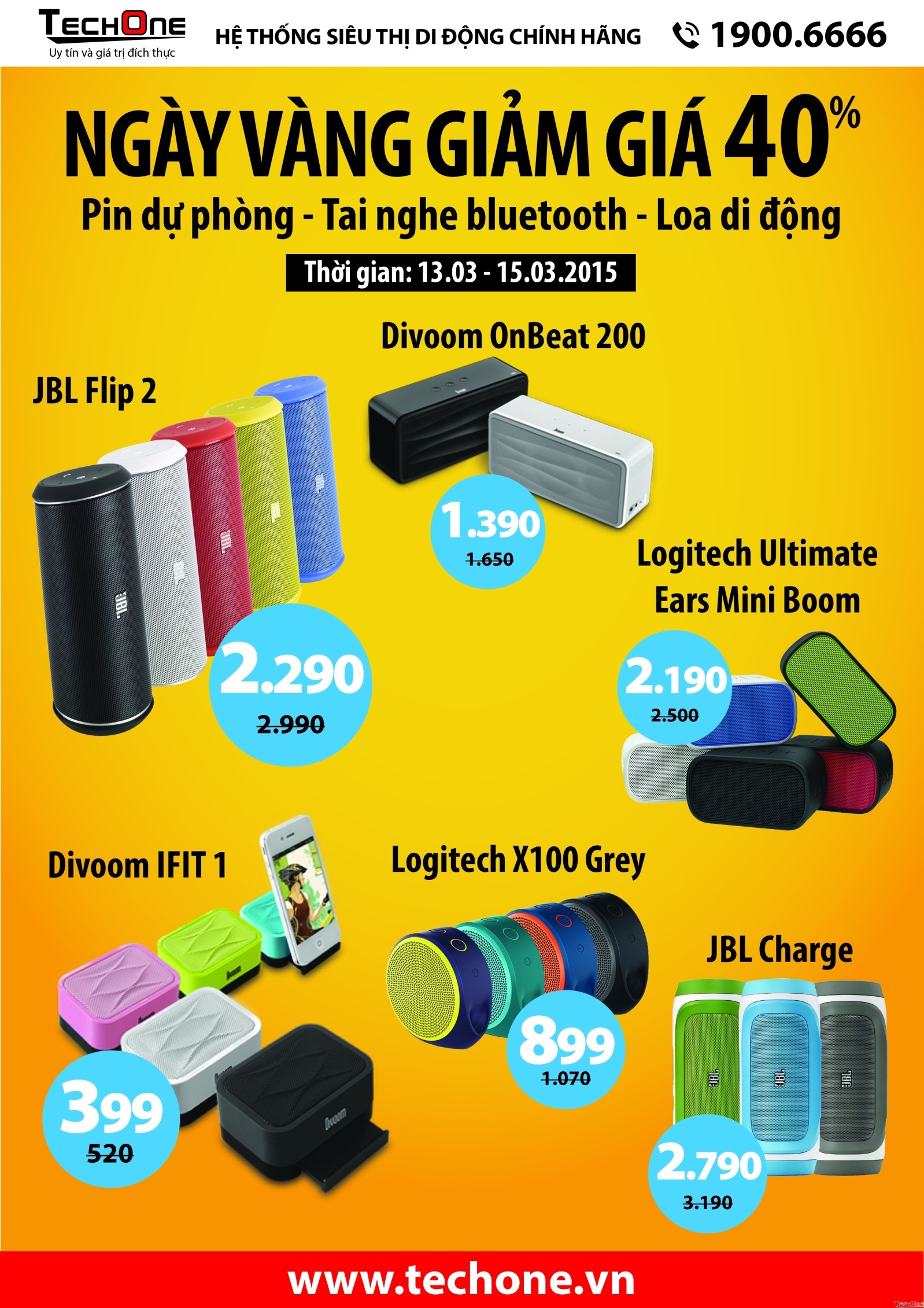 Đặc biệt, TechOne hiện còn triển khai chương trình giảm giá 40% pin dự phòng, loa di động và tai nghe Bluetooth trong 3 ngày vàng từ 13/3 đến 15/3.