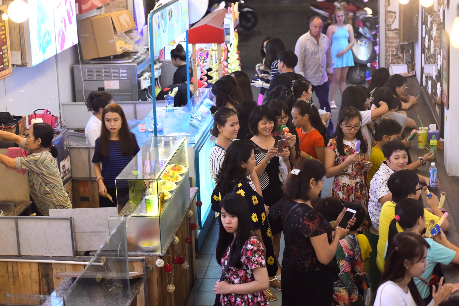 | Vào giờ cao điểm của phố đi bộ Nguyễn Huệ, dịch vụ ăn uống bình dân đông nghịt khách ra vào. Ảnh: Zen Nguyễn |