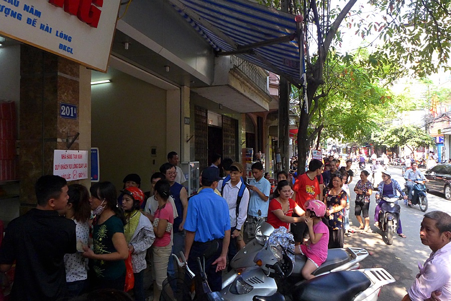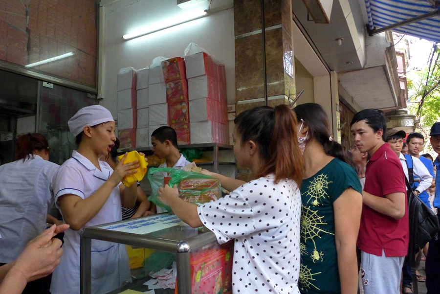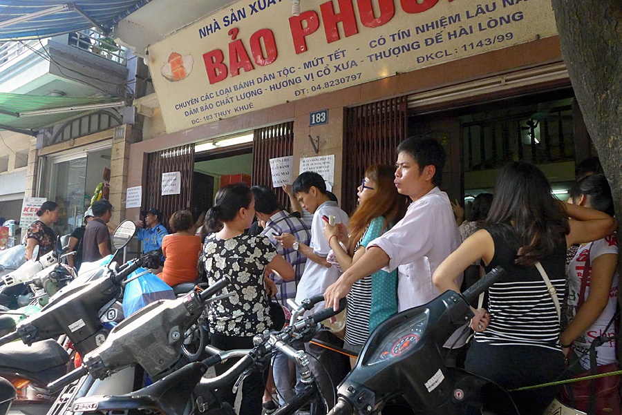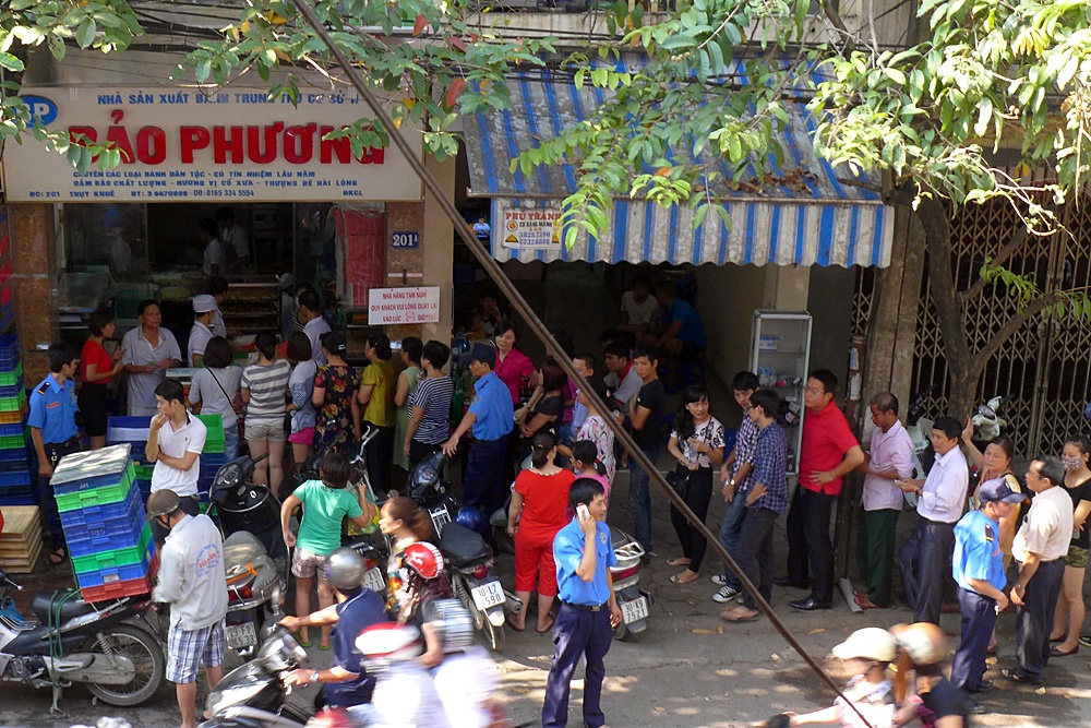 | Sáng thứ bảy 14/9, thời tiết đẹp, nắng nhẹ càng khiến nhiều người có thời gian đi xếp hàng mua bánh trung thu tại cửa hàng chuyên sản xuất truyền thống trên phố Thuỵ Khuê. |