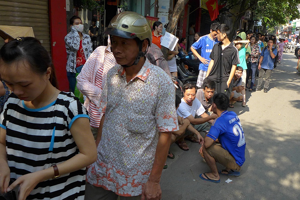 | Đứng mãi mỏi chân, cánh đàn ông ngồi thụp xuống xếp hàng tám chuyện chờ đợi. |