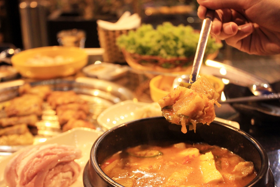 | Bạn cũng đừng quên thưởng thức sự hấp dẫn của thịt ba chỉ heo nướng trong tiếng Hàn được gọi là Samyeopsal, có nghĩa là “ba lớp thịt”. Miếng thịt ngon phải có đủ 3 lớp thịt nạc và mỡ xen kẽ. Khi nướng, thịt được thái miếng to dày bản và khứa đều để gia vị tẩm ướp thấm sâu vào tận bên trong và vẫn giữ được độ ngọt, mềm khi thưởng thức. |