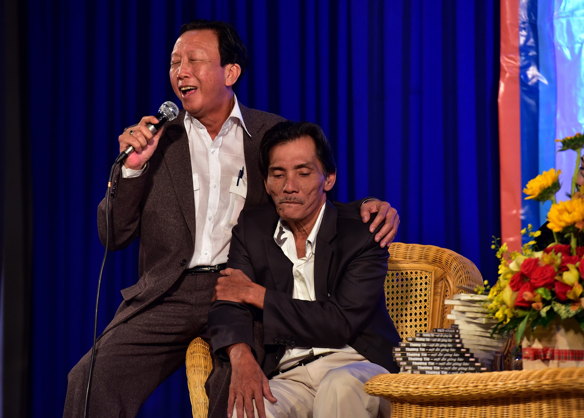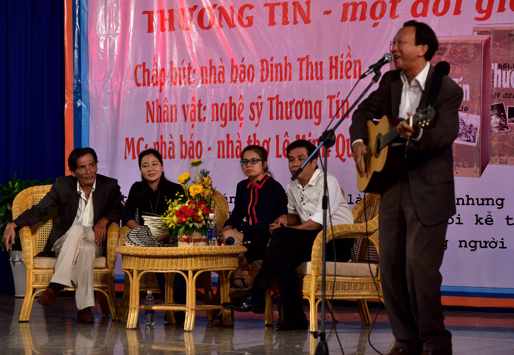 | Nhạc sĩ Thế Hiển cũng có mặt trong buổi ra mắt sách. Thương Tín đùa vui: "Đây là người đàn ông xuất hiện trong trang thứ 199 nghĩa là không có xuất hiện". |