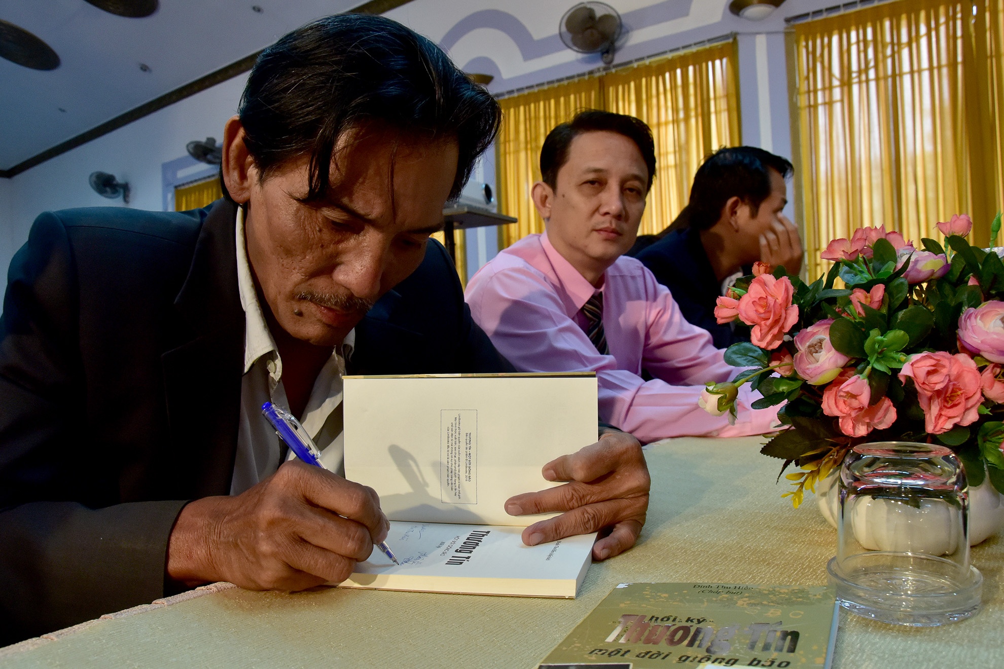 | Thương Tín cẩn thận ghi từng chữ ký tặng độc giả. |