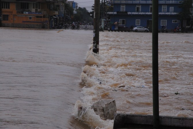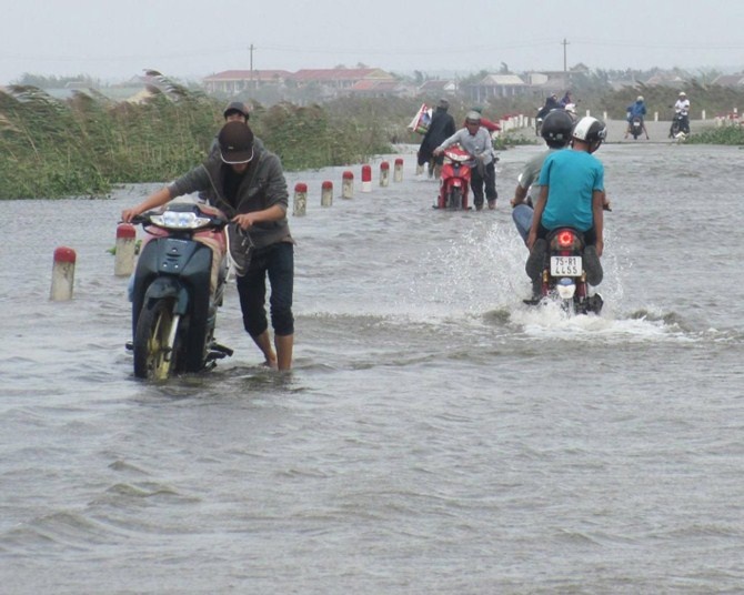 | Nước lũ ồ ạt tràn qua Đập Đá, TP Huế. |