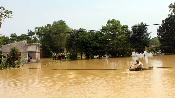 | Bị nước lũ bao vây, nhiều người dân ở thôn Kén, xã Tượng Sơn, huyện Nông Cống (Thanh Hóa) phải dùng thuyền thúng đi lại . |