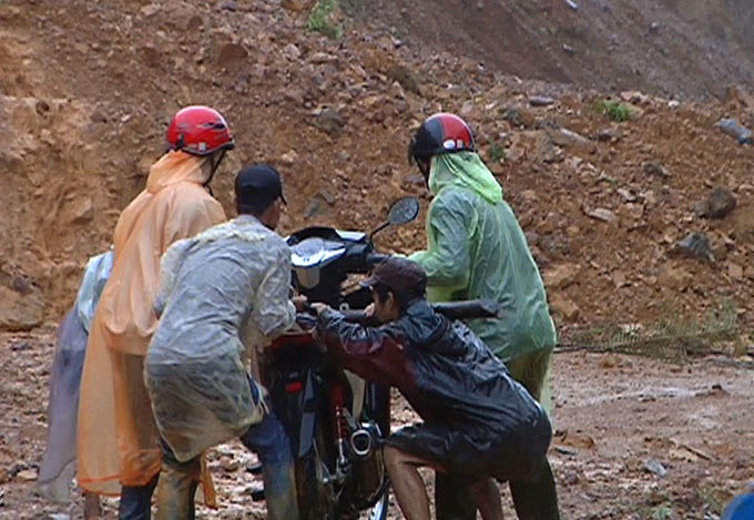 Thanh tra Sở GTVT Quảng Ngãi, Hạt Quản lý đường bộ Trà Thủy đã chốt chặn không cho người và phương tiện đi lại. Tuy nhiên, nhiều người vẫn tìm cách đưa xe máy qua vùng núi lở.