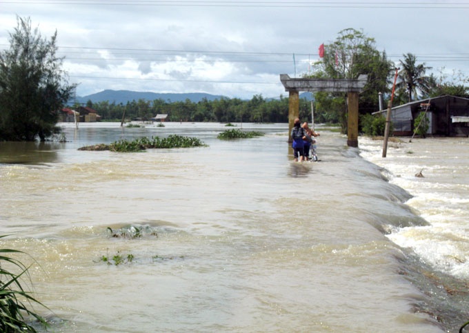 | Bất chấp nguy hiểm, người dân, trẻ em ở huyện Bình Sơn (Quảng Ngãi) vẫn băng qua đường lũ tràn. |