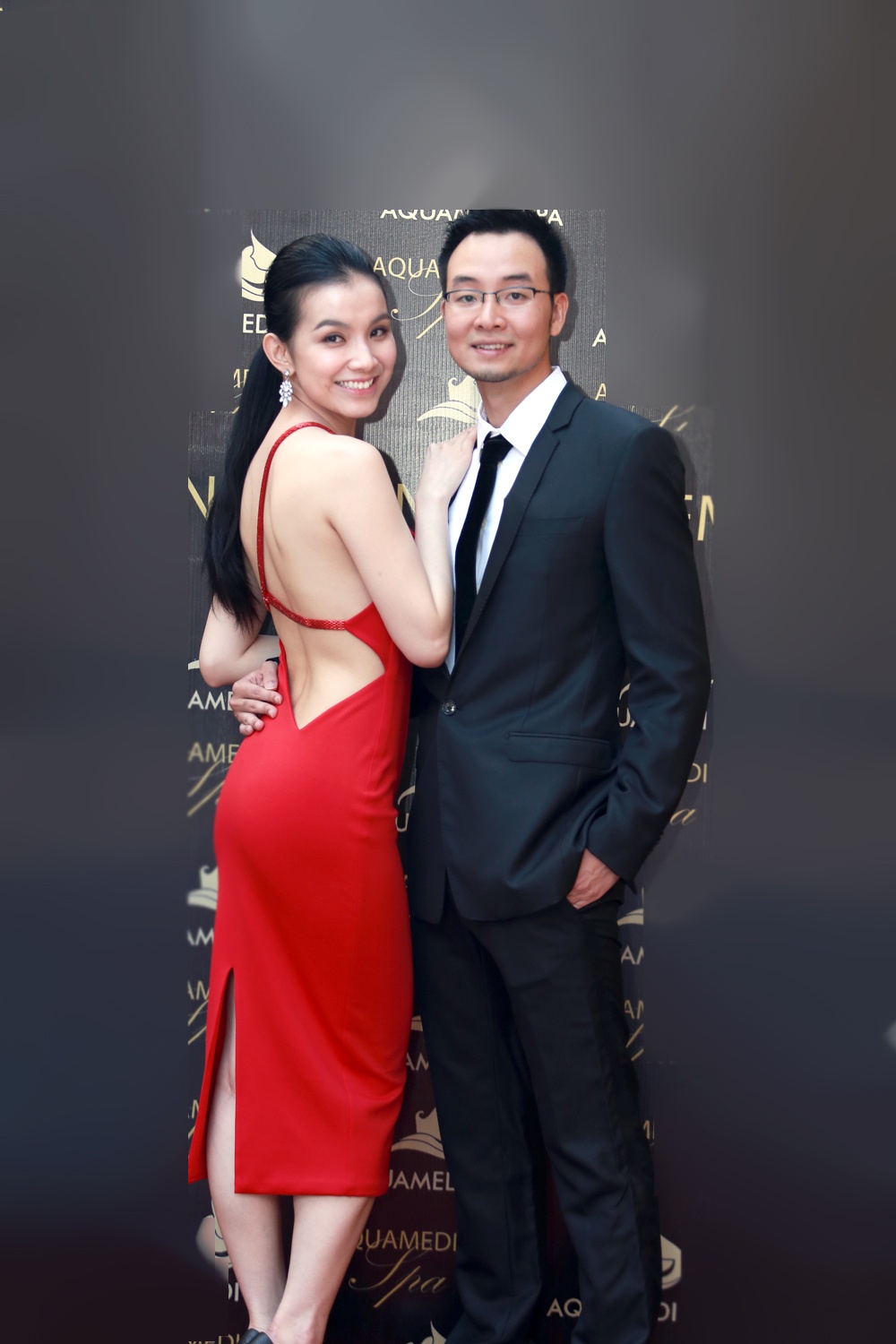 | Bà mẹ hai con quyến rũ với bộ đầm đỏ cut out. Trong sự kiện tối 30/8, tiến sĩ Nguyễn Anh Tuấn - chồng của Hoa hậu - cũng xuất hiện để ủng hộ bà xã. |