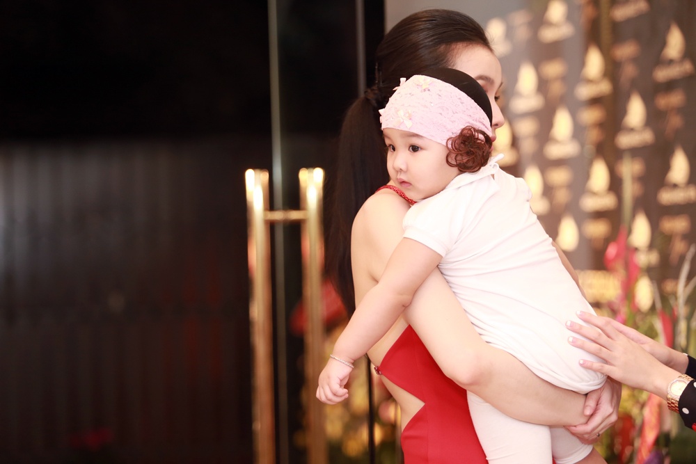 Hoa hậu Hoàn vũ 2008 lần đầu xuất hiện cùng hai con nhỏ trong sự kiện khai trương spa do cô làm chủ vào tối 30/8 tại Hà Nội.
