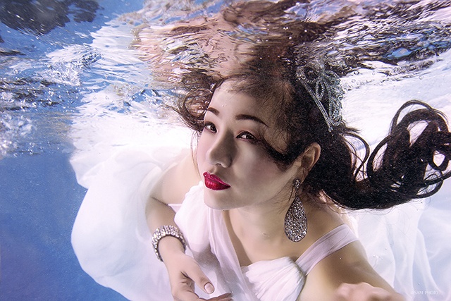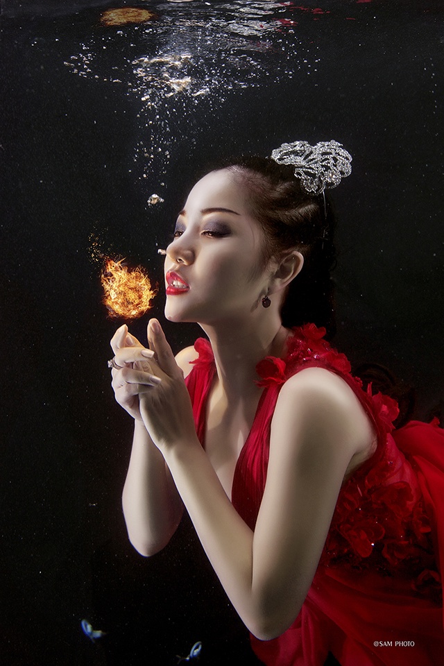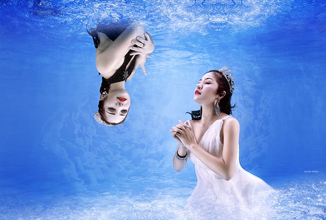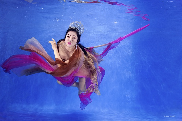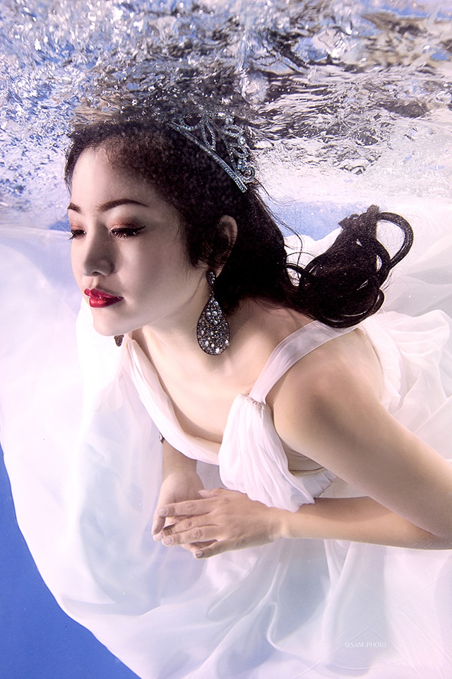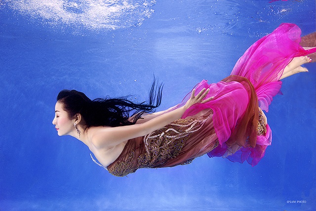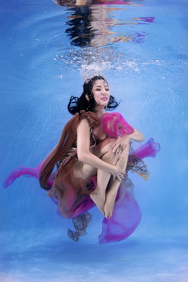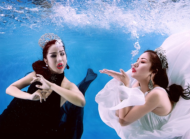 | Nữ danh hài Thúy Nga chia sẻ thêm: "Buổi chụp diễn ra dưới nước nên ai cũng vất vả hết. Tôi ngâm mình dưới nước là cũng khoảng ngần ấy thời gian stylist Helen Phương cùng ngâm mình trong nước với tôi. Nhiếp ảnh gia Sam thì cũng nhịn ăn chờ chụp cho xong bộ ảnh trong vòng 7 giờ đồng hồ trong tâm trạng vui vẻ và hào hứng. Điều tôi cảm thấy hơi áy náy nhất là những bộ đầm mới của NTk Quỳnh Paris đã bị tôi ngâm nước ướt nhẹp". |