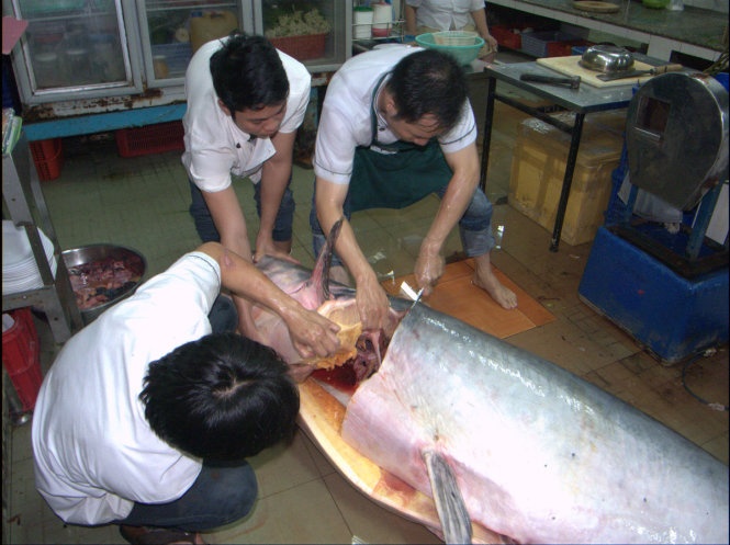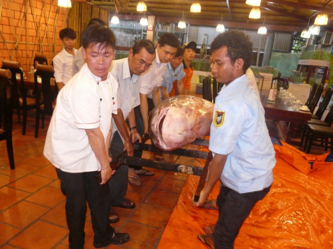 | Với chiều dài trên 2m và trọng lượng gần 230 kg, con cá tra dầu này được ghi nhận là loại cá nước ngọt lớn nhất có mặt tại TP.HCM. Trước đó, một nhà hàng khác tại TP.HCM cũng mới mua lại con cá Hô nặng khoảng 130 kg được ngư dân bắt được tại Q.9, TP.HCM |