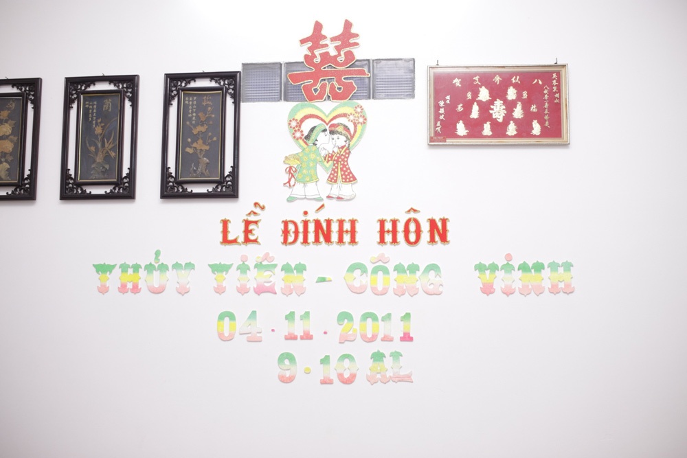 | Phông chữ lễ đính hôn của Thủy Tiên và Công Vinh từ ngày 4/11/2011 đến nay vẫn được giữ trên tường. |